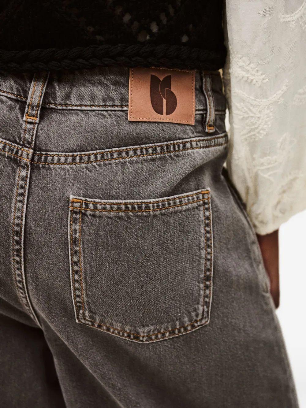 Темно-серые широкие брюки с шлевками для ремня, задним накладным карманом и застежкой на пуговицу
