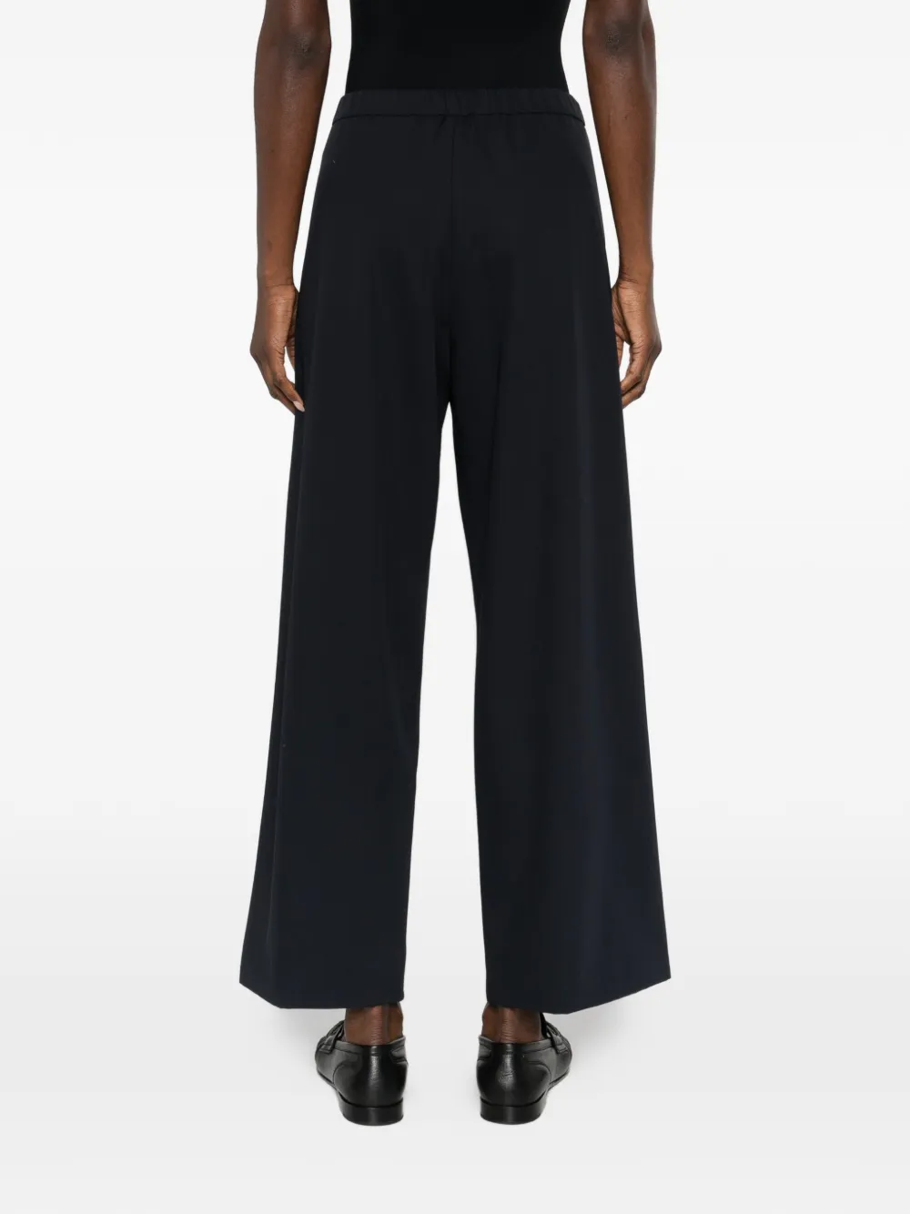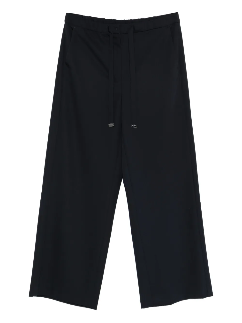 Морского синего цвета, с шнурком, боковыми прорезными карманами, металлической фурнитурой, укороченными и широкими штанинами