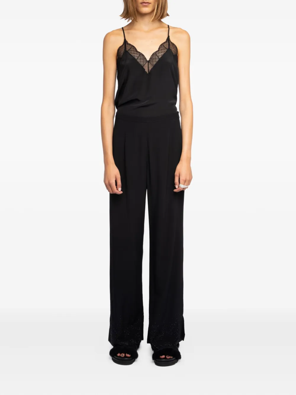 Черные брюки с отделкой стразами, боковой молнией, широкими штанинами и разрезом по подолу