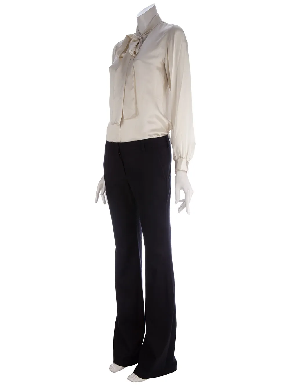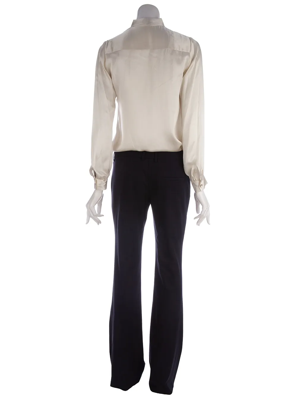 • Темно-синие брюки от L'Agence с пятью шлевками для ремня, потайной застежкой спереди, двумя боковыми карманами, двумя задними карманами и расклешенными штанинами.