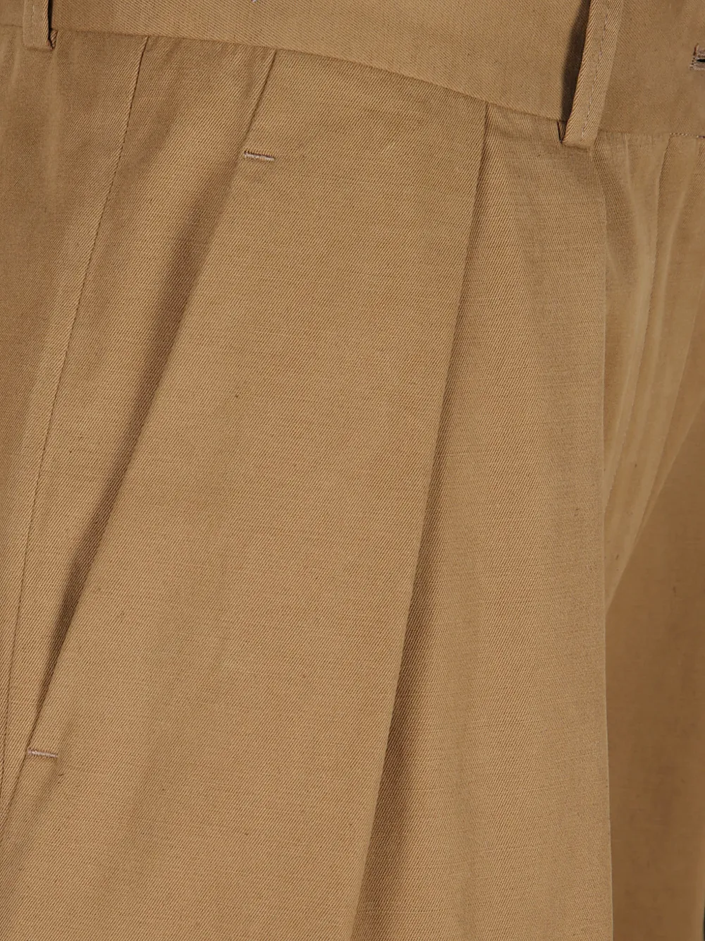 Темно-песочный цвет, плиссировка, застежка на пуговицы, шлевки для ремня, прямые брючины, стандартная посадка