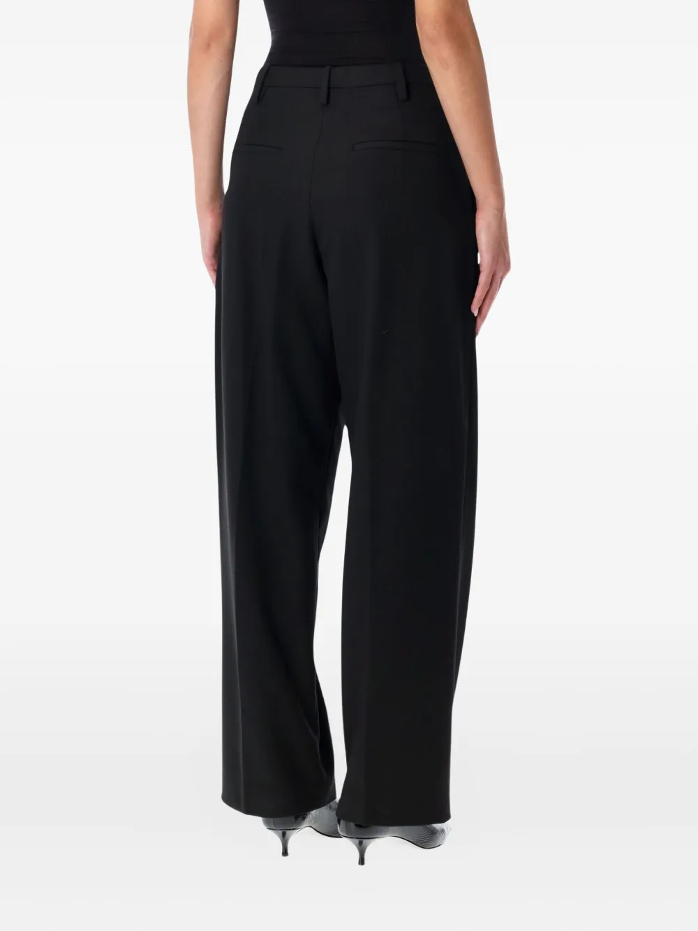 Черные складки, шлевки для ремня, боковые карманы в шве, задние прорезные карманы, потайная застежка спереди