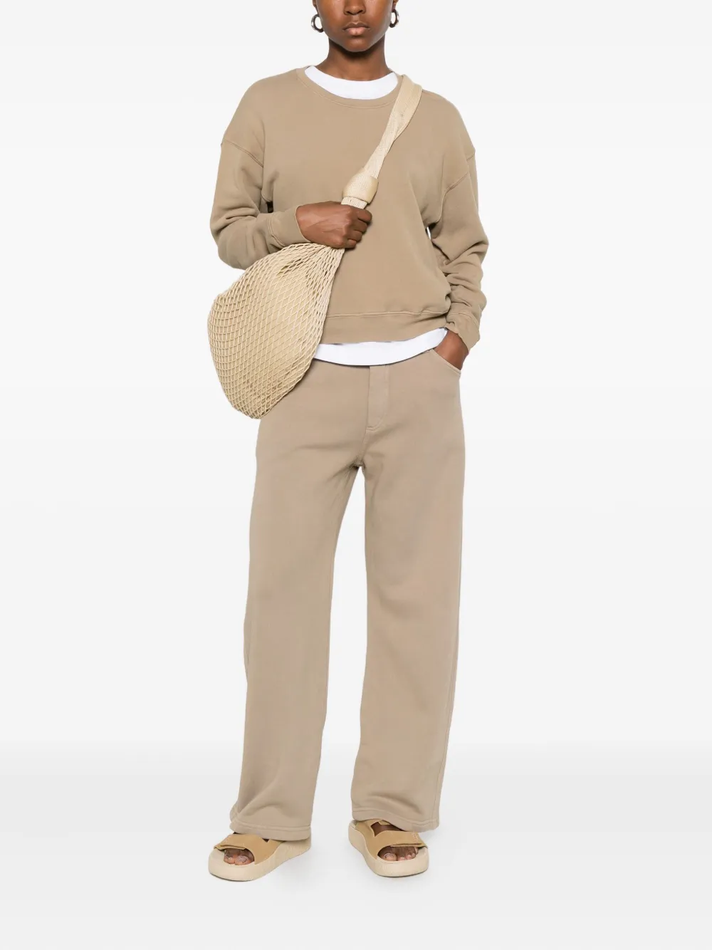 Песочный тауп, накладные передние карманы, шлевки для ремня, отделка строчкой, прямые брюки, стандартная обработка