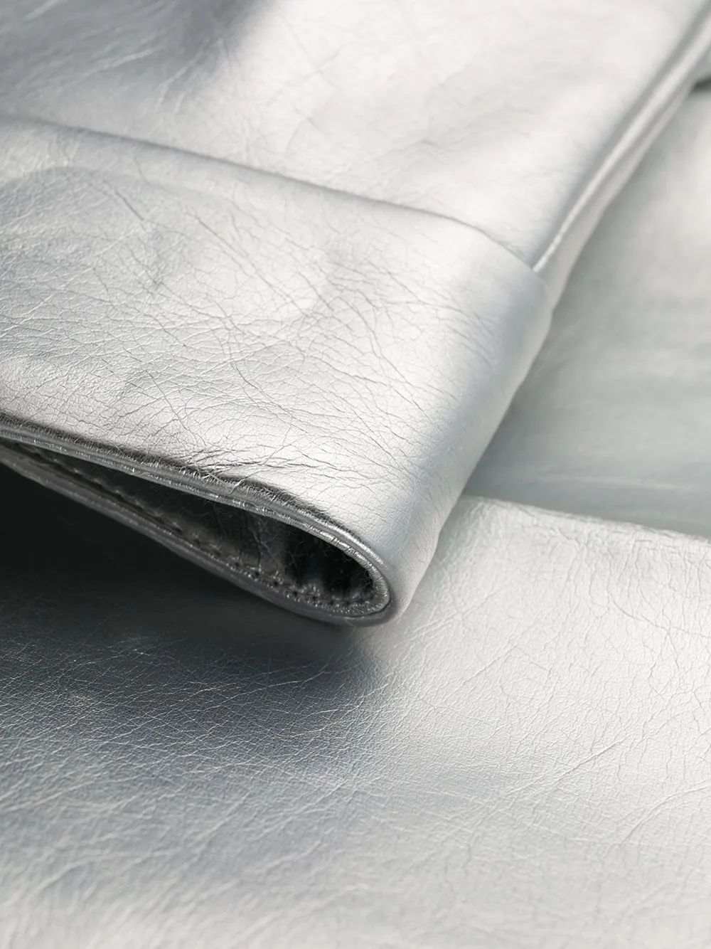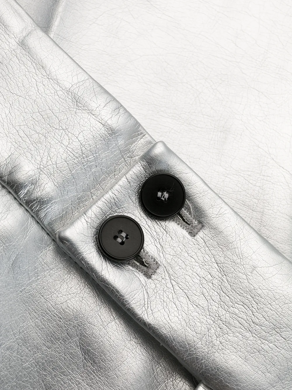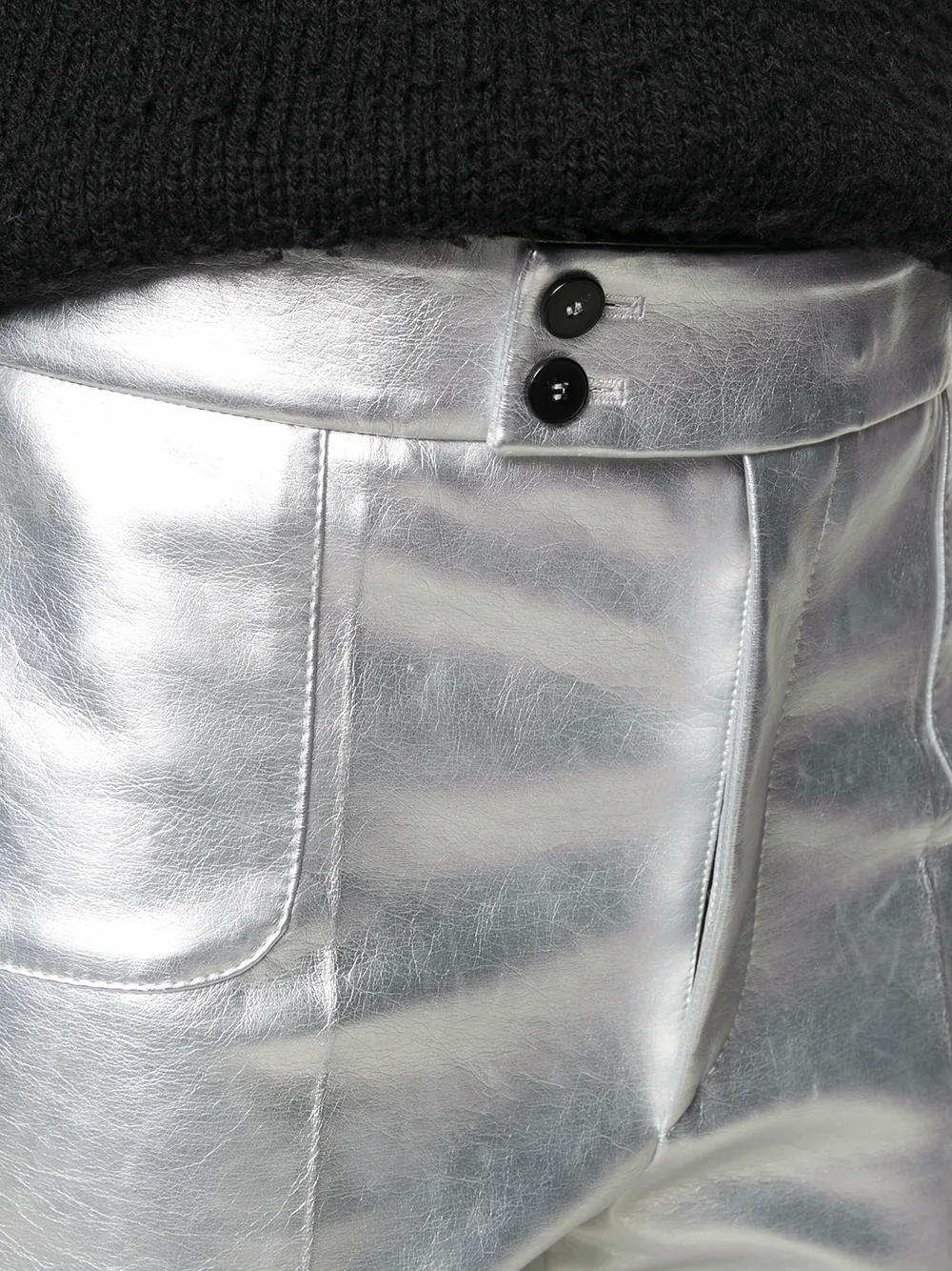 Эффект металлик, застежка на пуговицы и два прорезных кармана по бокам.