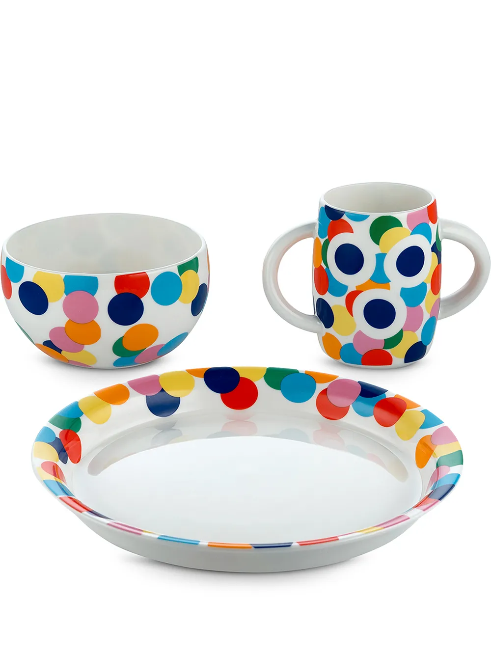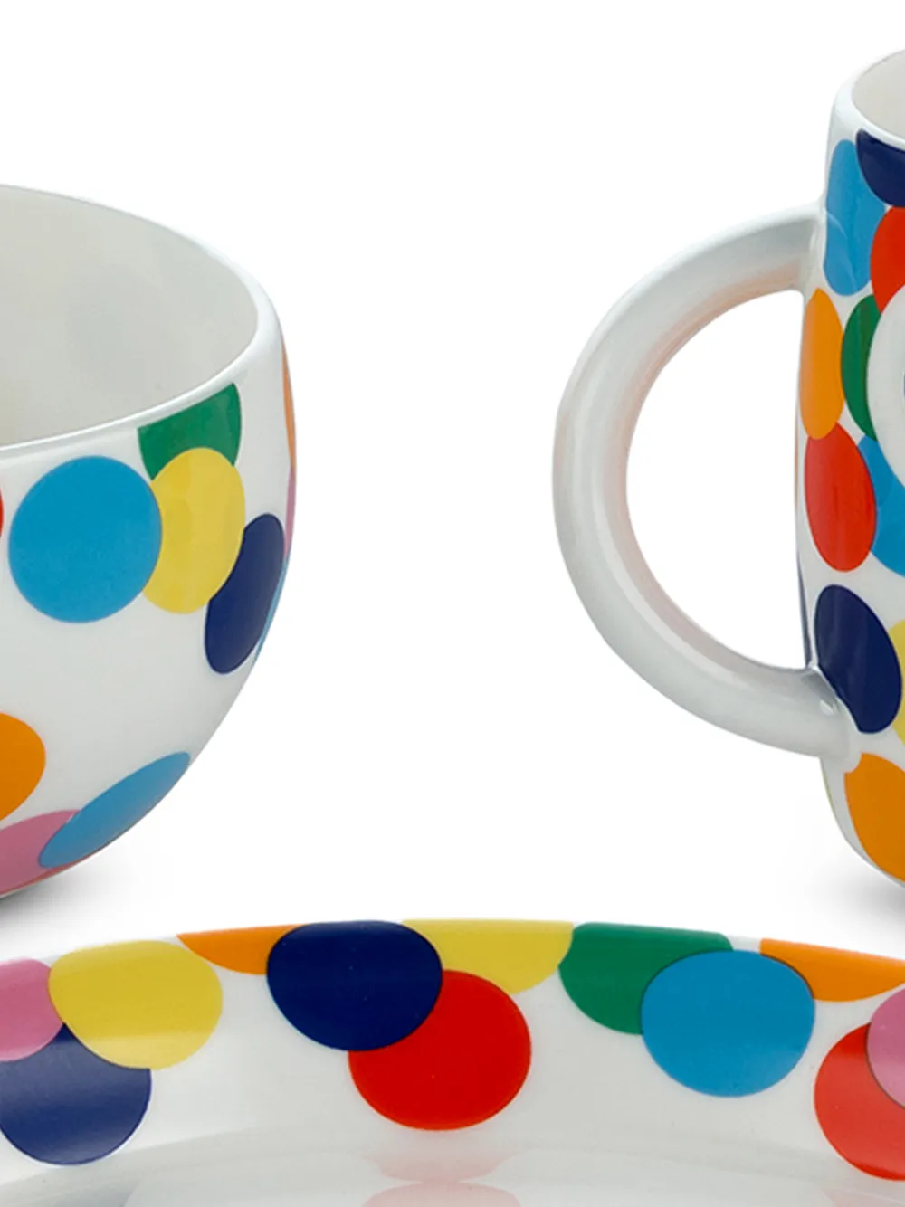 Принт в горох, круглая форма, две закругленные ручки по бокам и подходит для мытья в посудомоечной машине.