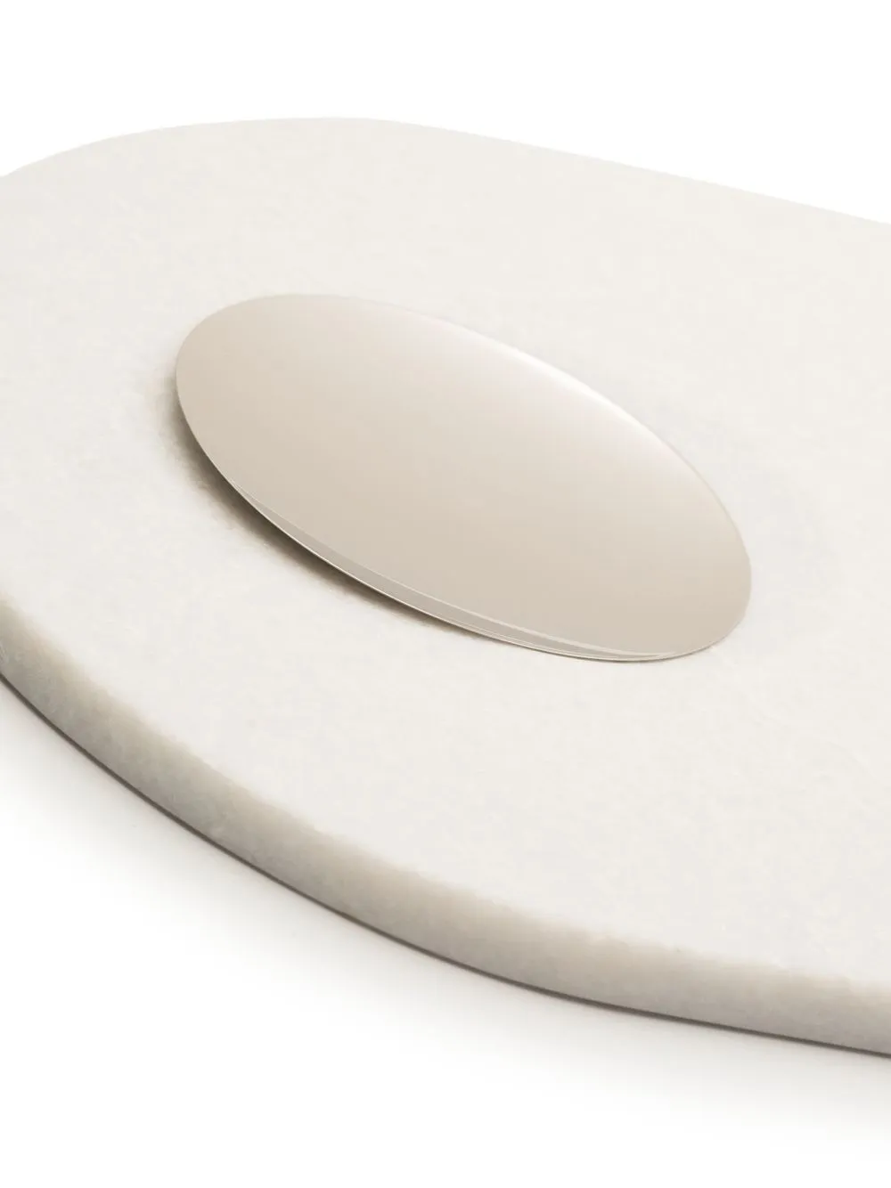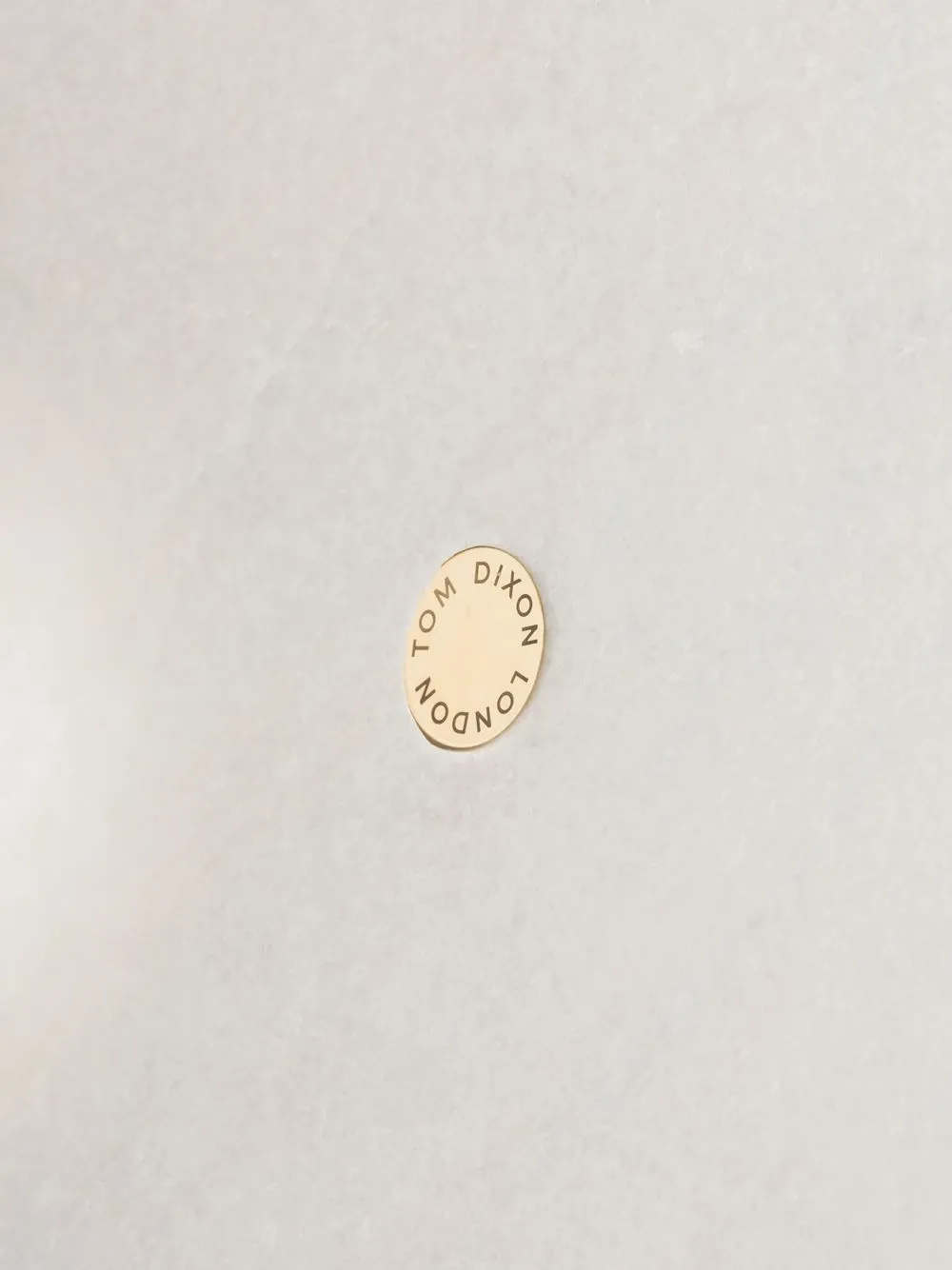 Светло-серый, мрамор, закругленная форма и золотистый металлический логотип.