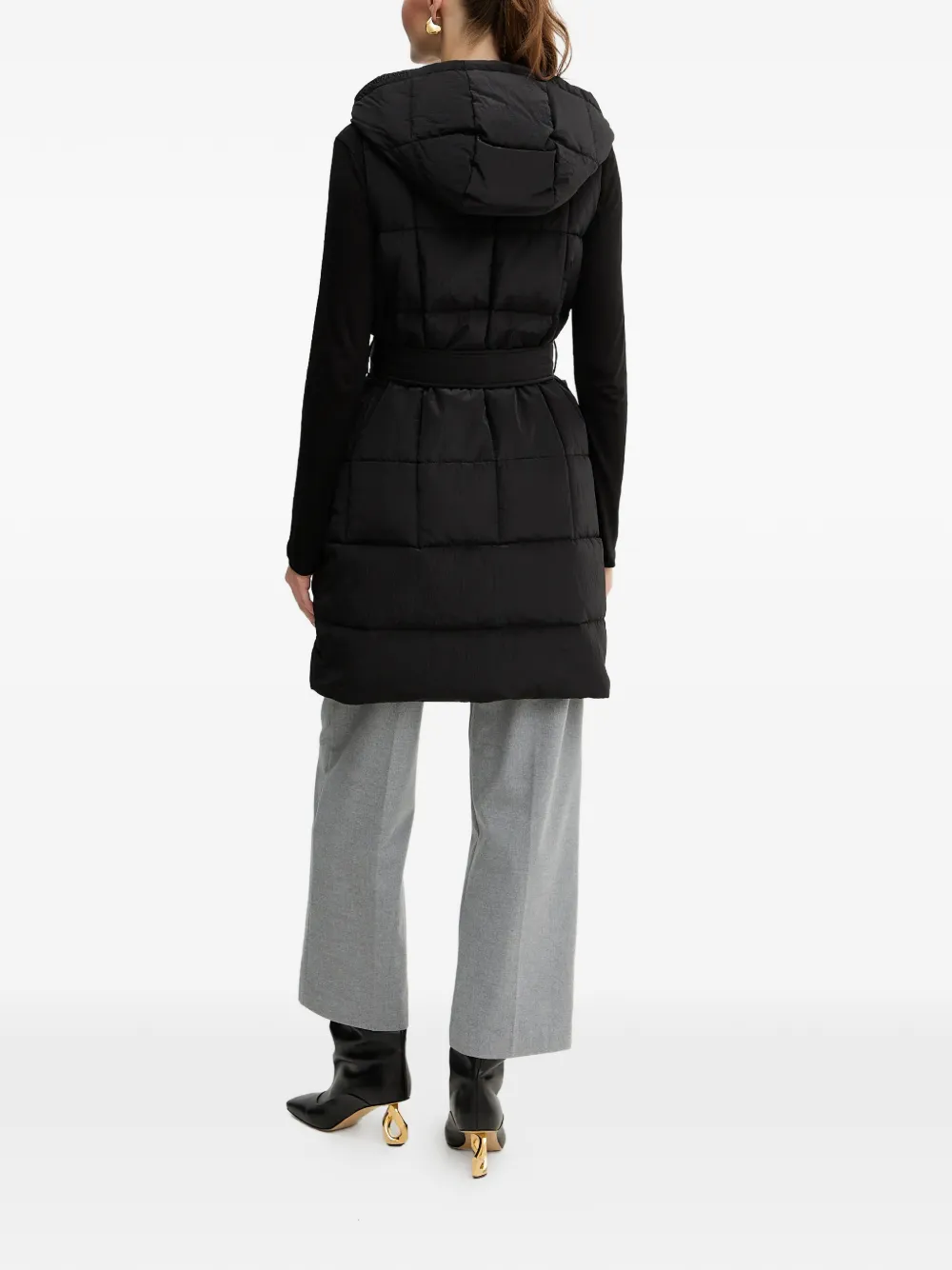 Черный цвет, стеганый узор, накладные карманы, пояс на талии, застежка-молния