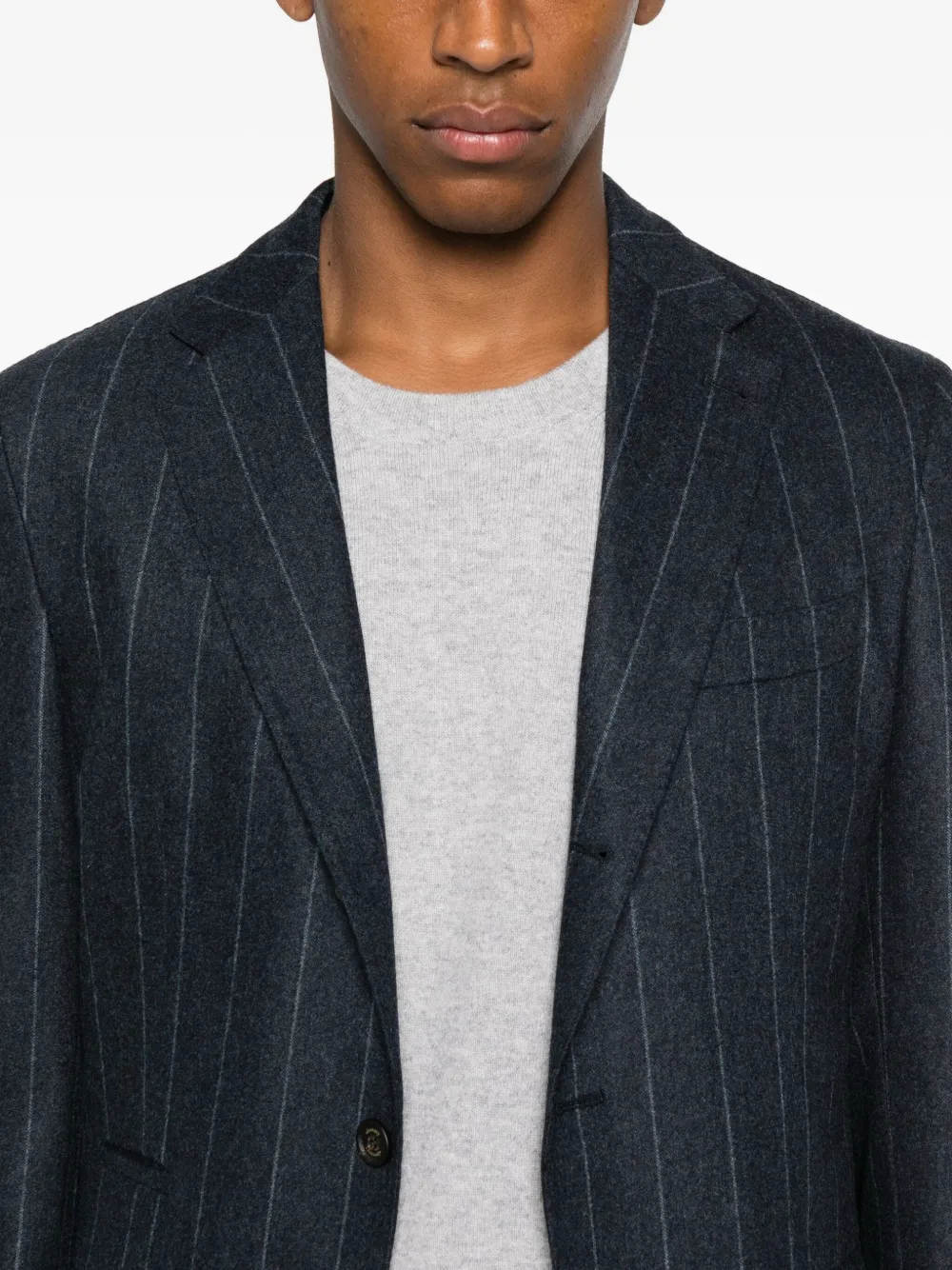 Темно-серый костюм в тонкую полоску, застегивается на пуговицы, лацканы с вырезом, карманы с клапанами, прямые брюки