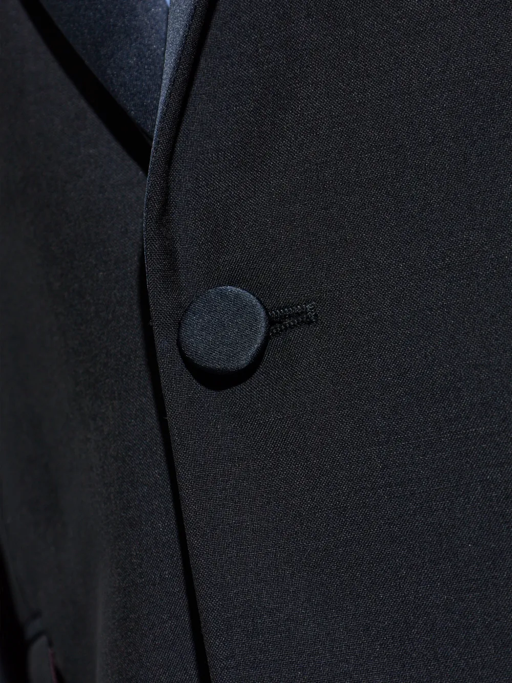 Темно-синий шерстяной пиджак с шалевым воротником, застежкой на одну пуговицу, клапанами на карманах, заутюженными стрелками и сатиновыми лампасами