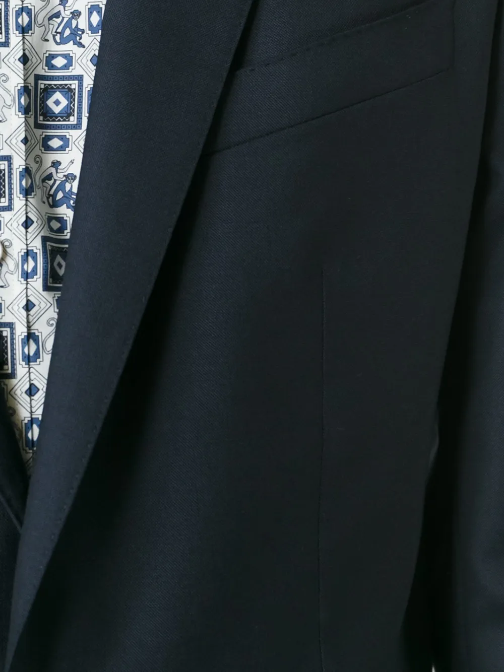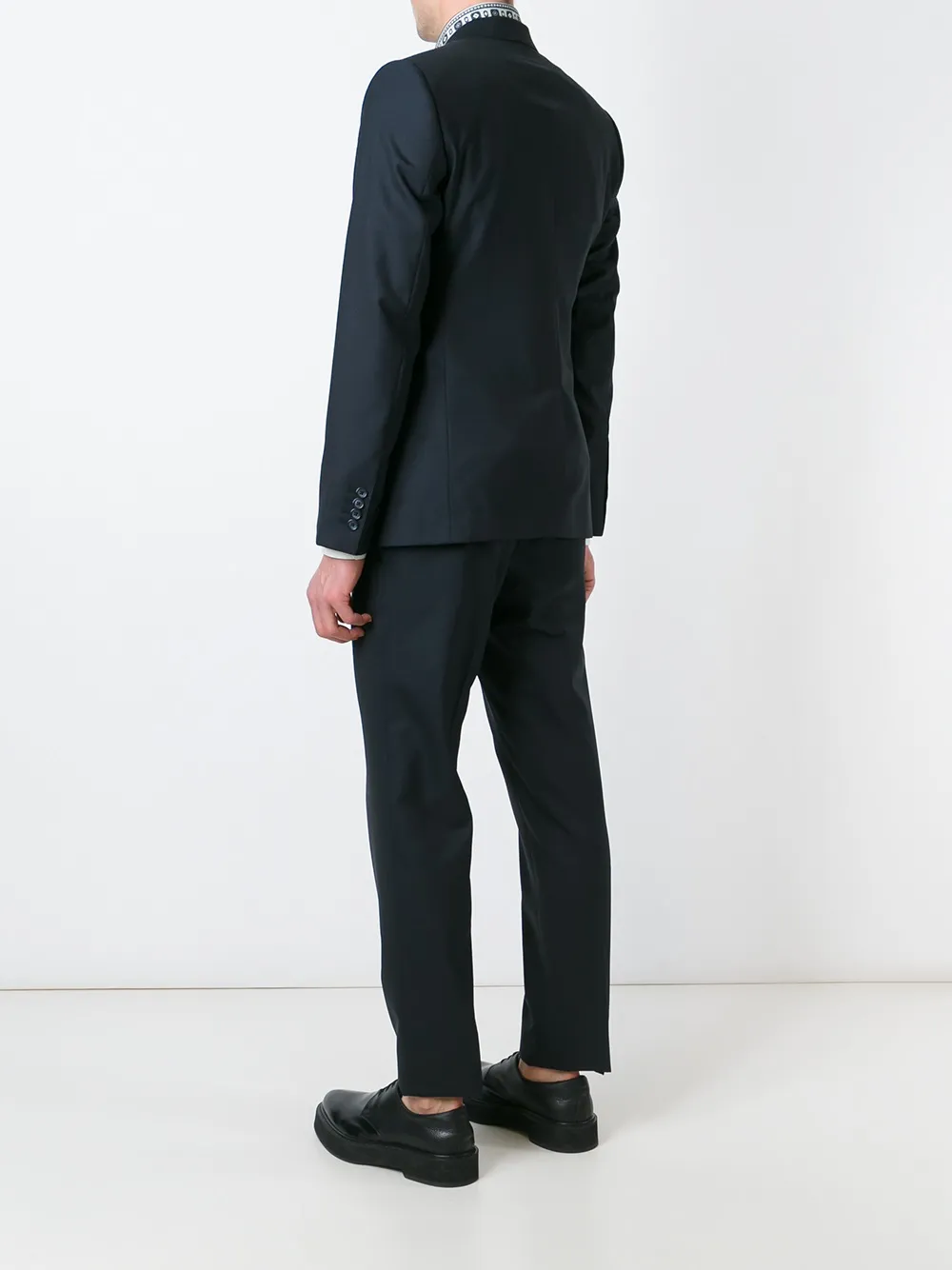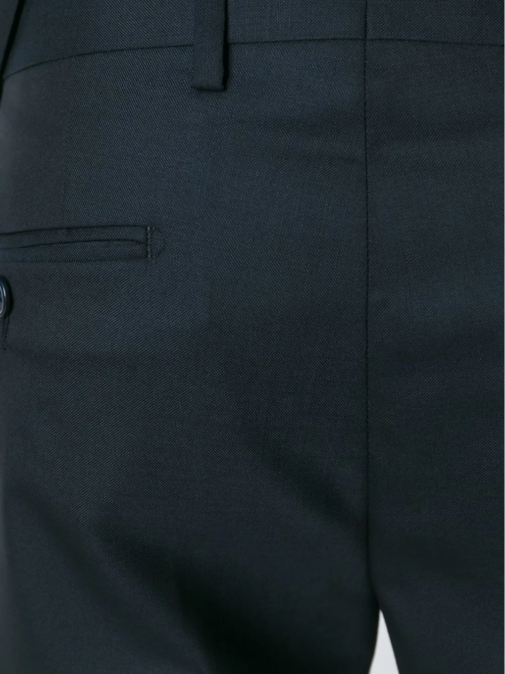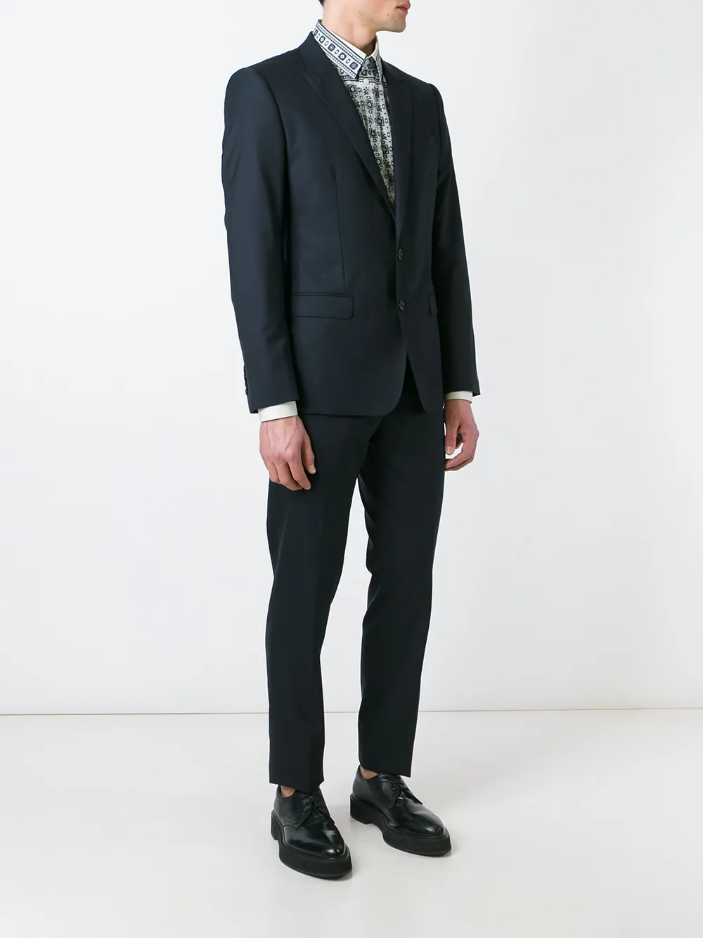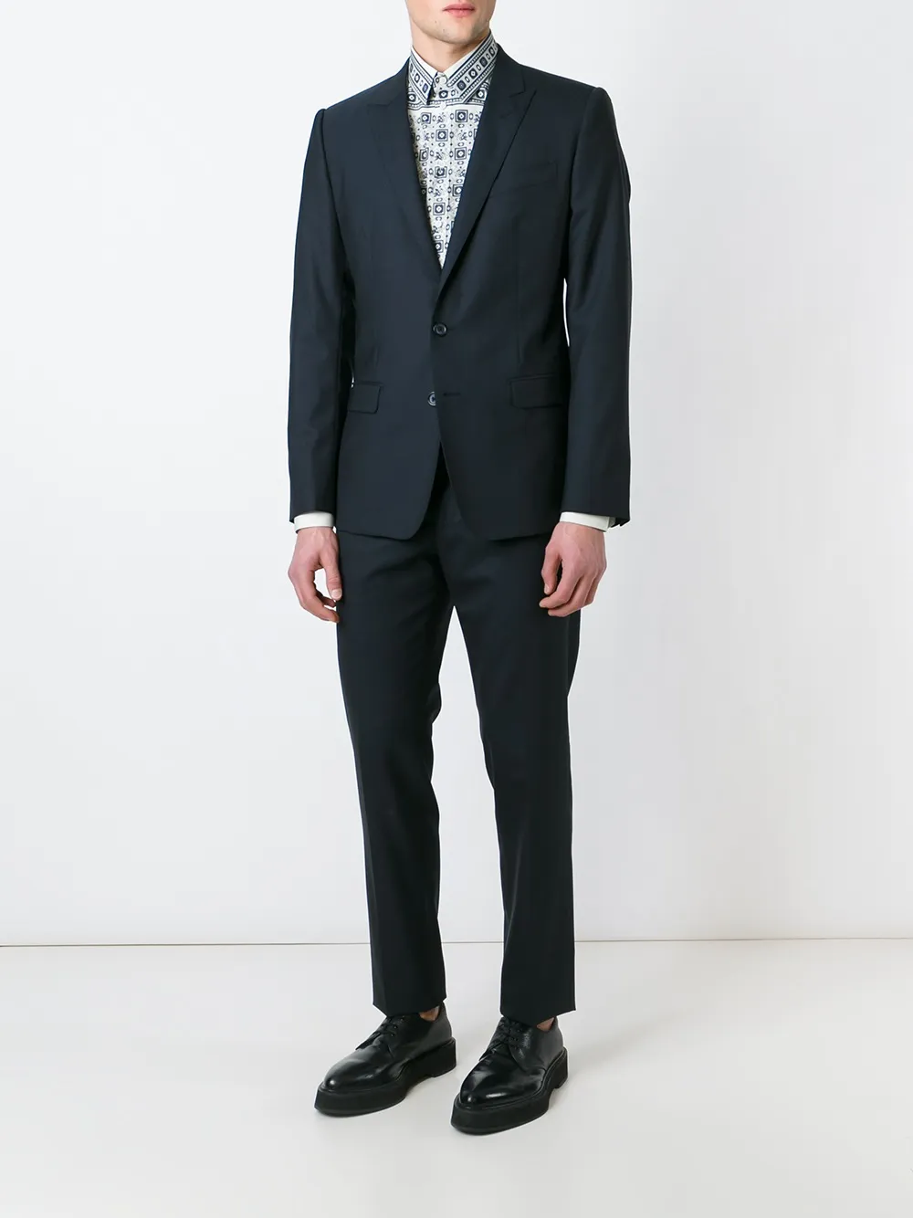Черный классический костюм-двойка из натуральной шерсти от Dolce & Gabbana. Пиджак: заостренные лацканы, широкий карман с листочкой на груди, застежка на пуговицах спереди, передние карманы с клапанами, длинные рукава, манжеты на пуговицах, шлица сзади. Брюки: пояс с петлями для ремня, потайная застежка спереди, два вшитых кармана по бокам, прорезные карманы сзади, узкий крой слим, складки.