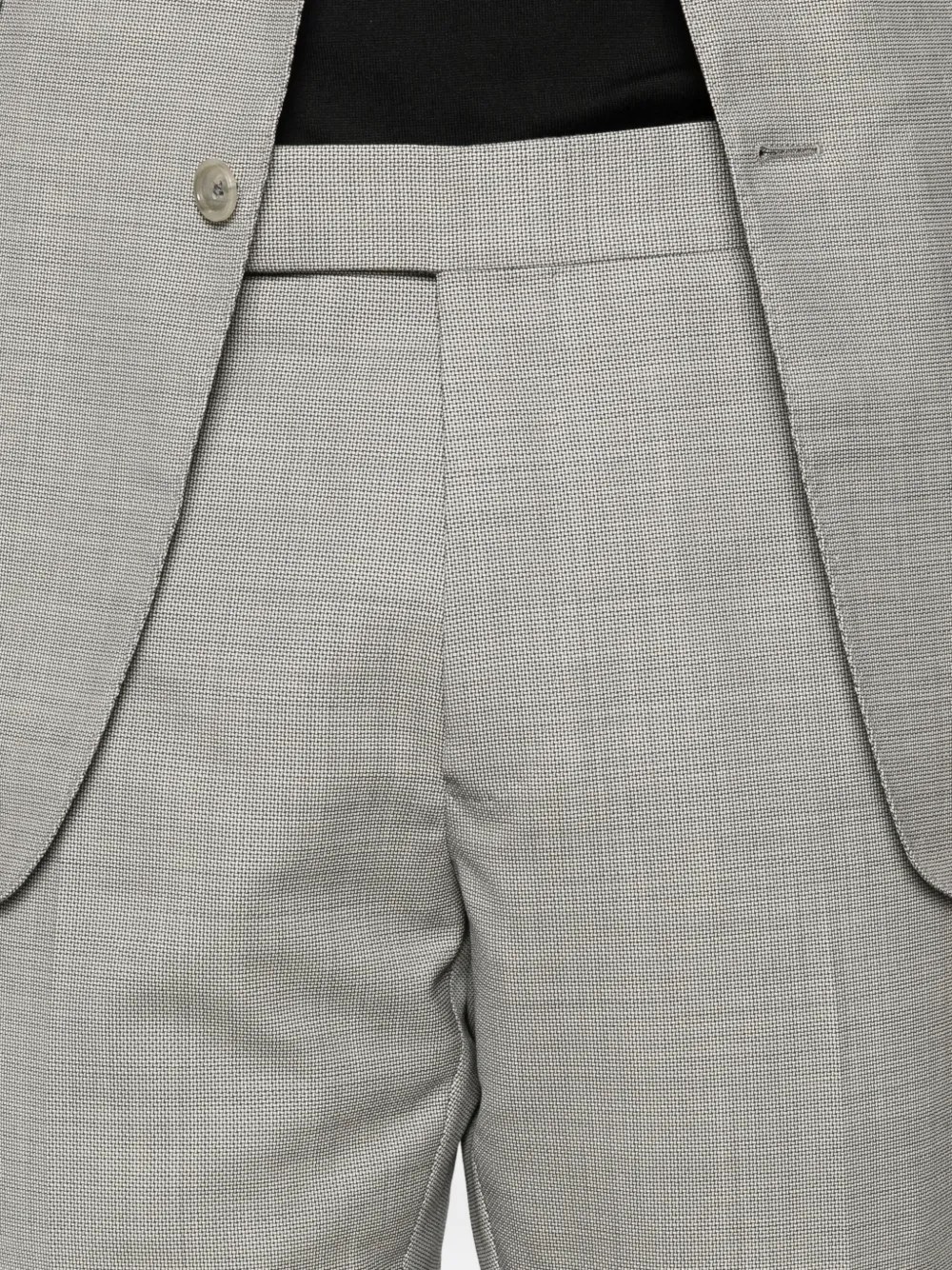 Серый костюм-двойка с клапанами на карманах, застежкой на одну пуговицу и лацканами с острыми концами