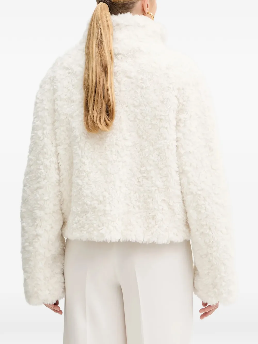 Белый дизайн из искусственного меха, два боковых кармана, воротник-стойка, скрытая застежка на кнопках, длинные рукава, прямой подол