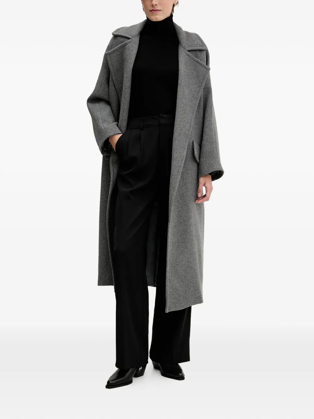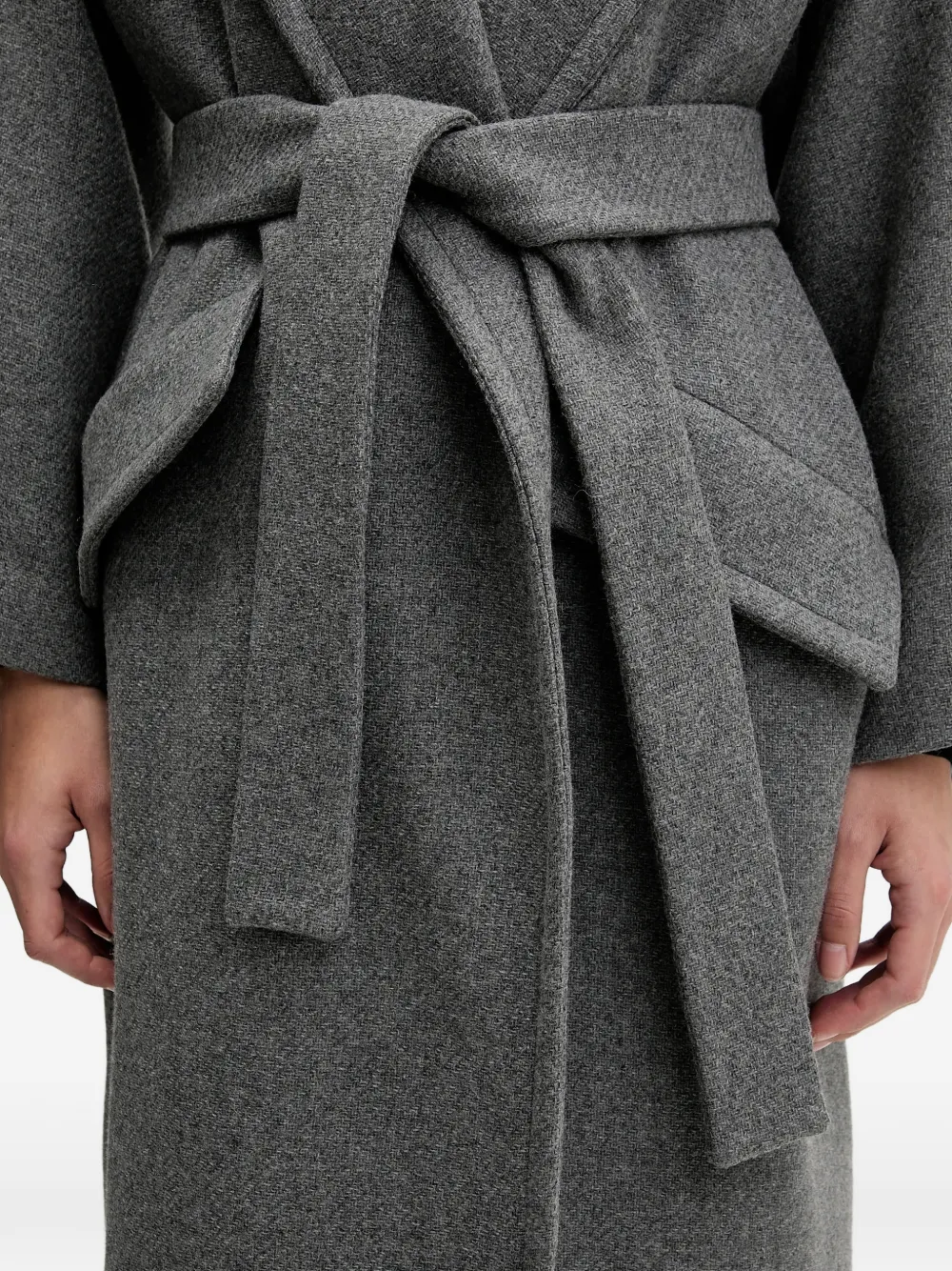 Серые лацканы с вырезом, клапанные карманы, пояс на завязке, длинные рукава