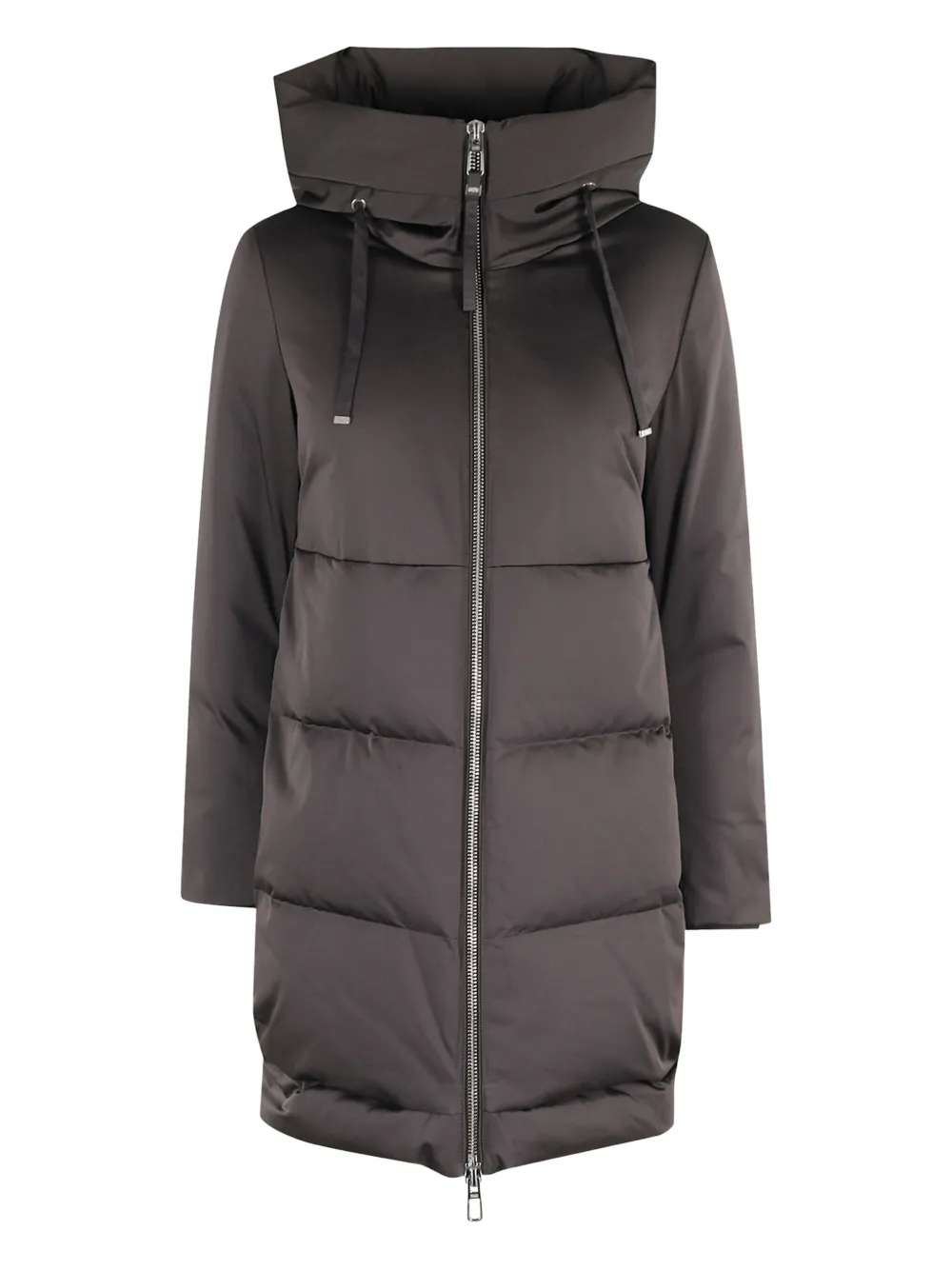 Пуховик темно-коричневого цвета с капюшоном на кулиске, застежкой на молнии и длинными рукавами