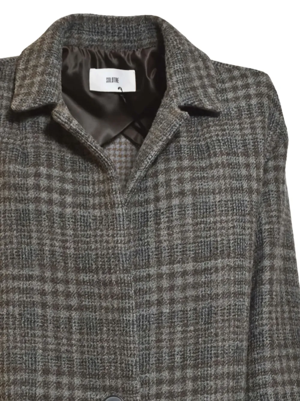 Коричнево-серый клетчатый узор, застежка на пуговицы, воротник с лацканами, длинные рукава