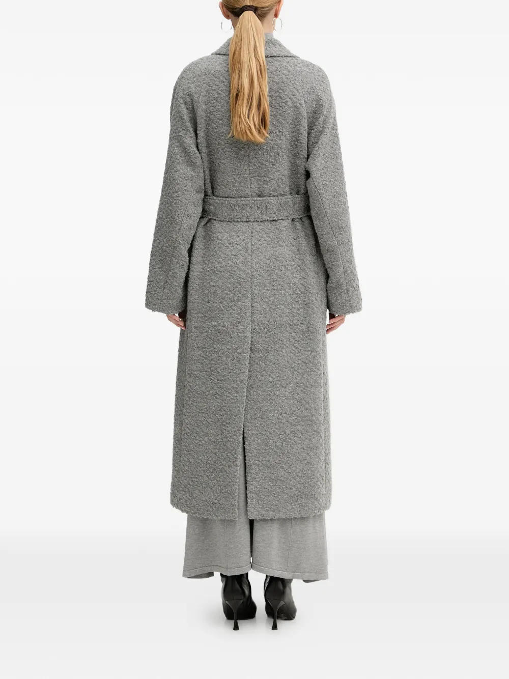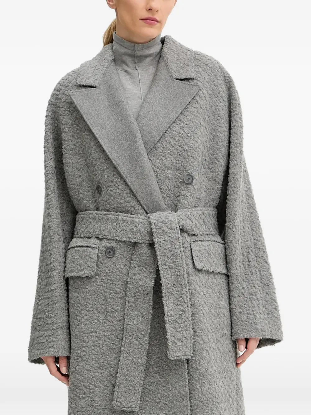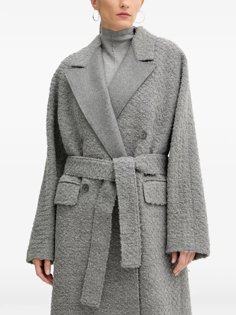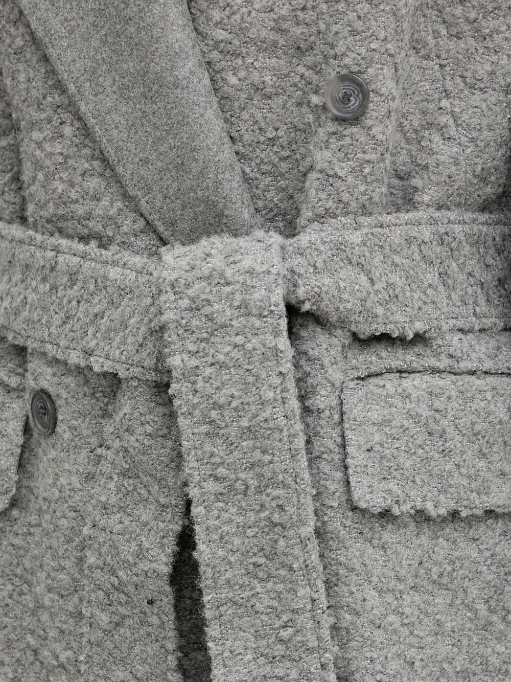 Серый цвет, текстура букле, двубортная застежка на пуговицы, лацканы с острыми концами, два накладных клапанных кармана спереди, пояс на талии, длинные рукава, вентиляционная складка сзади