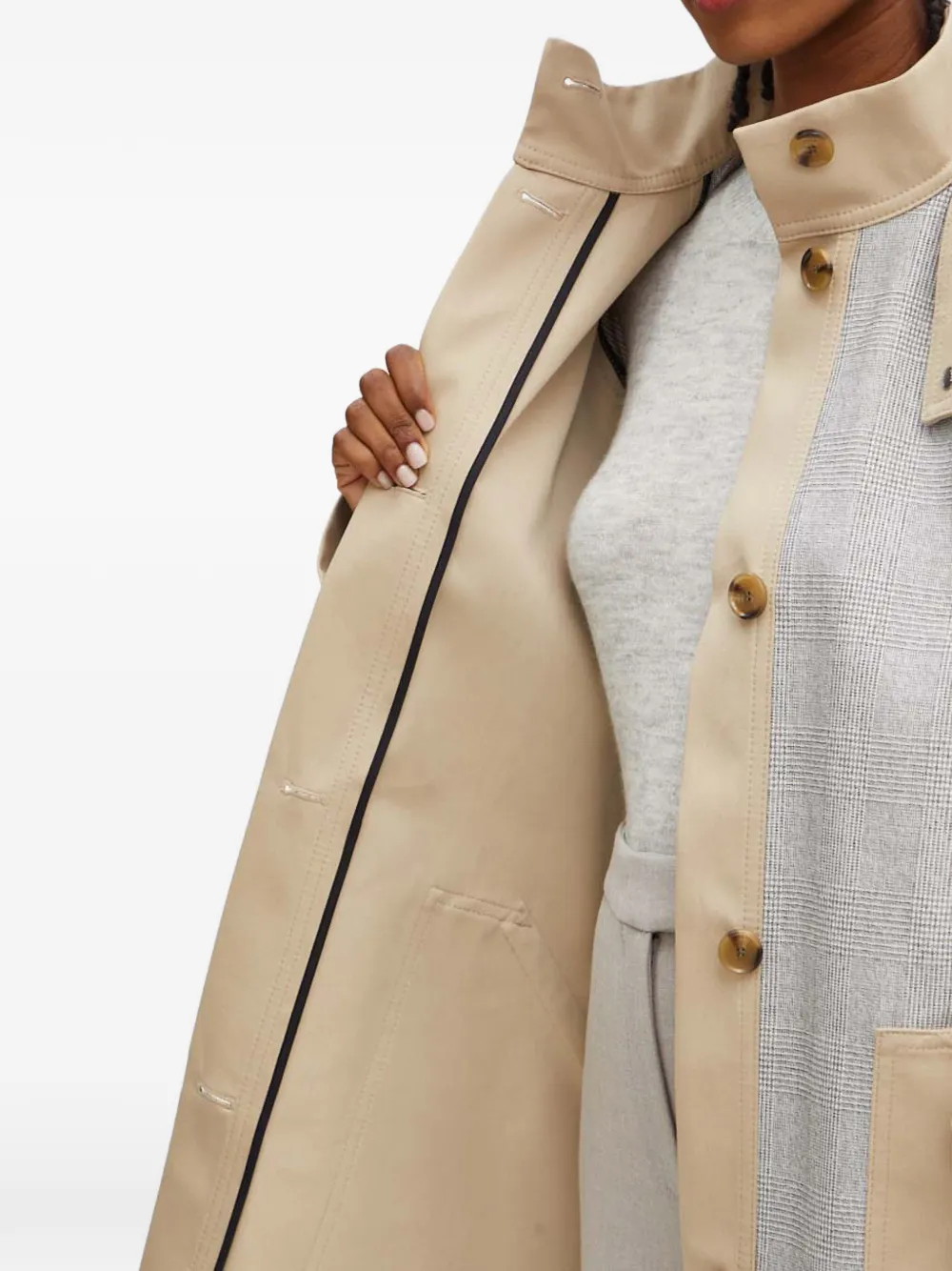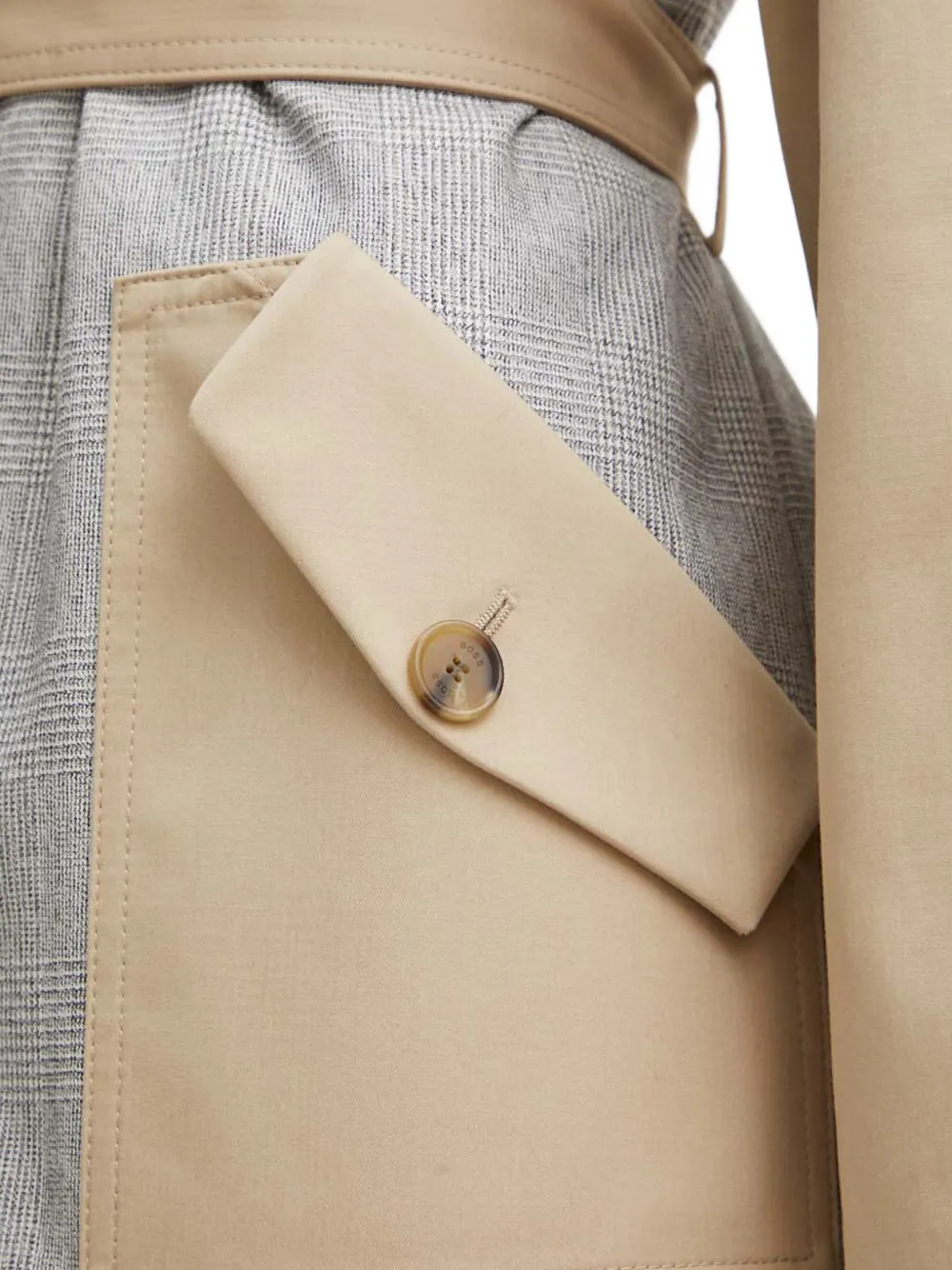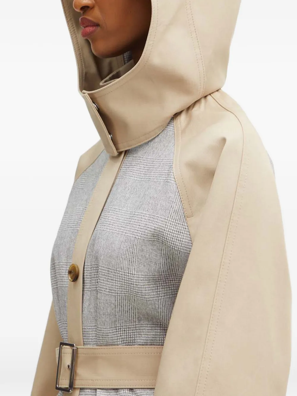 Бежевый клетчатый с поясом, застежкой на пуговицы, карманами и капюшоном