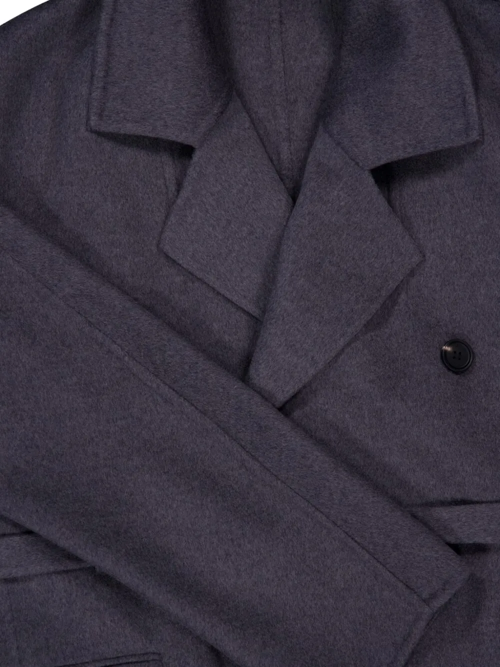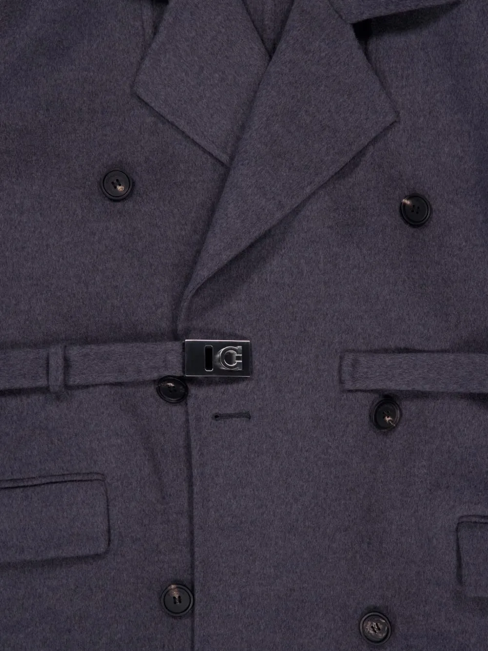 Серый двубортный пиджак с поясом на талии, застежкой на пуговицы, лацканами с вырезом и клапанами на карманах