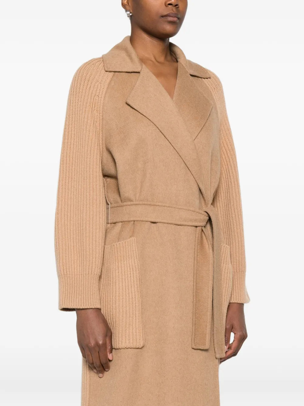 Верблюжий коричневый цвет лацканы с вырезом длинные рукава регулируемый пояс накладные карманы по бокам