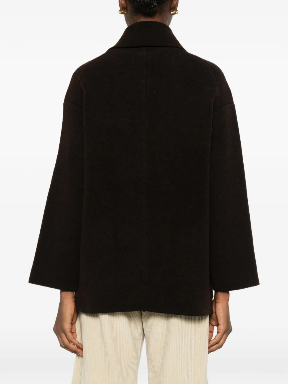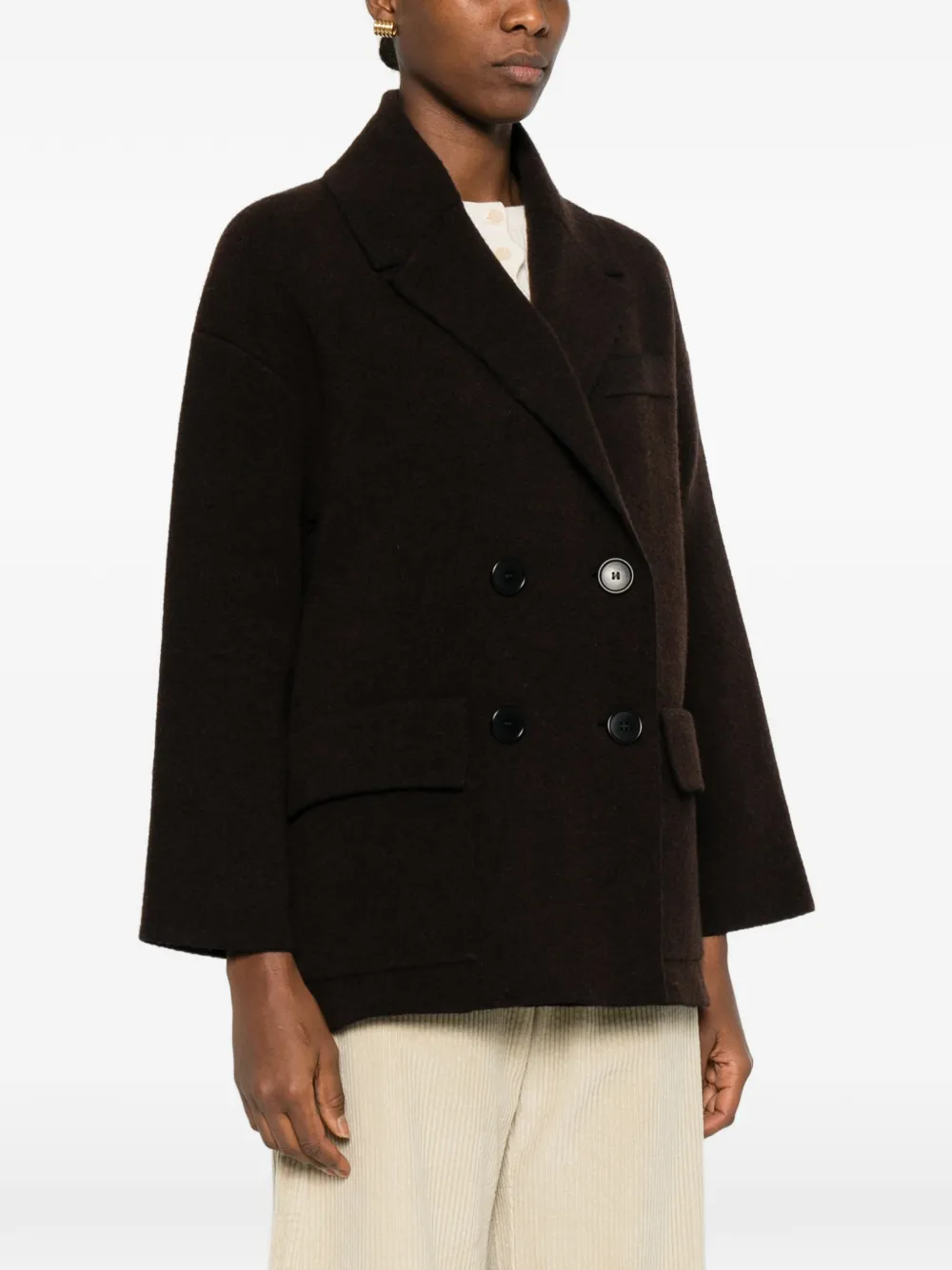 Коричневый двубортный пиджак с лацканами с вырезом, передними клапанными карманами, длинными рукавами и застежкой на пуговицы