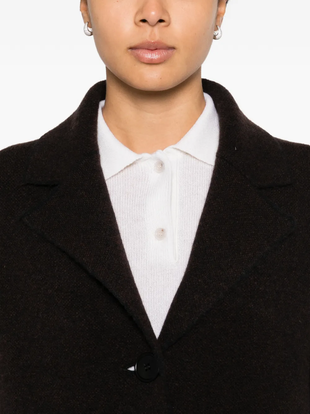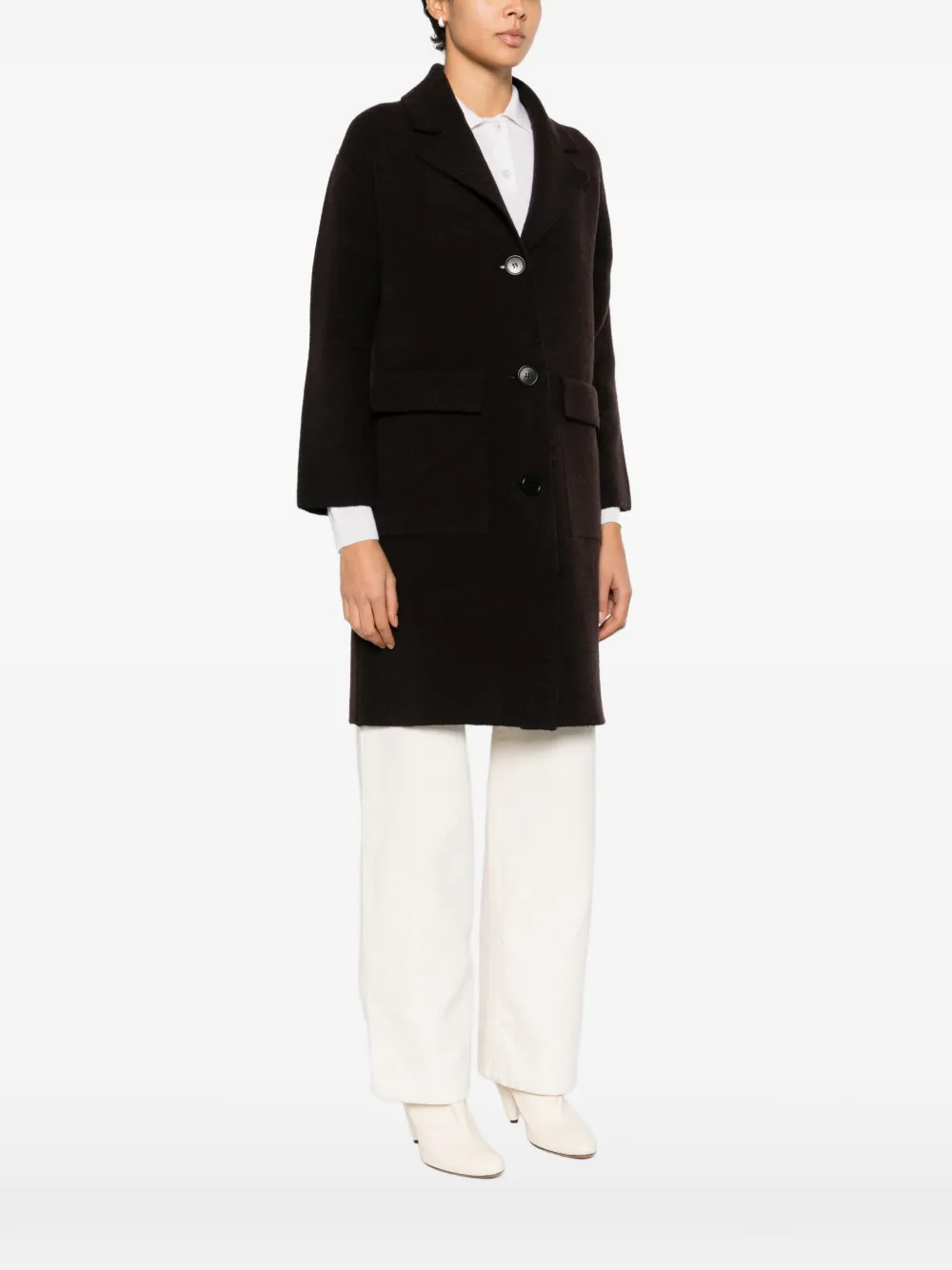 Коричневый, застежка на пуговицы спереди, лацканы, накладные карманы спереди, длинные рукава, средней длины