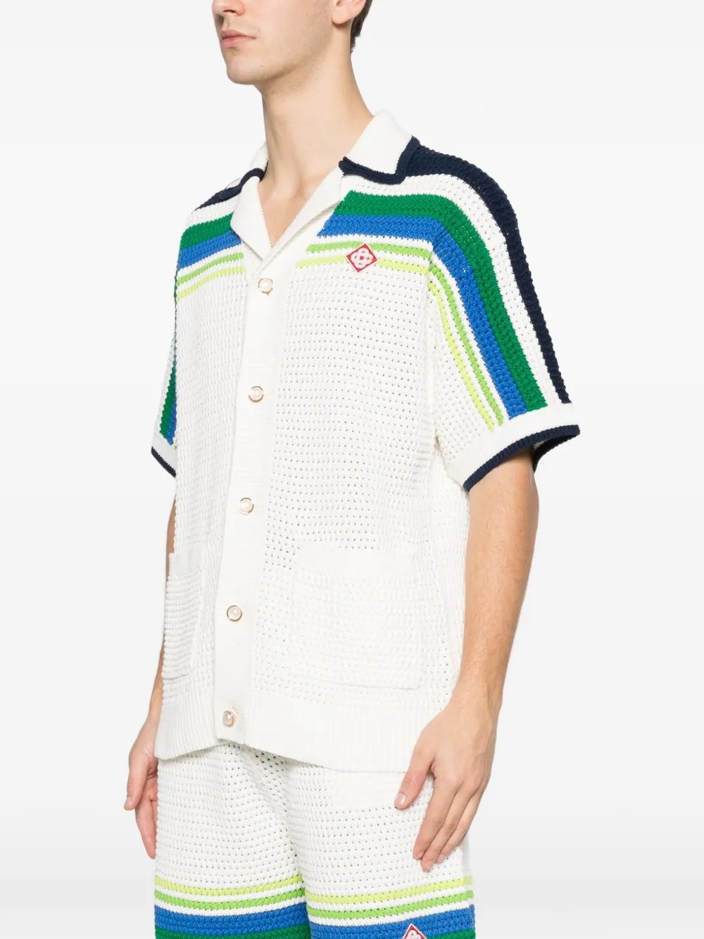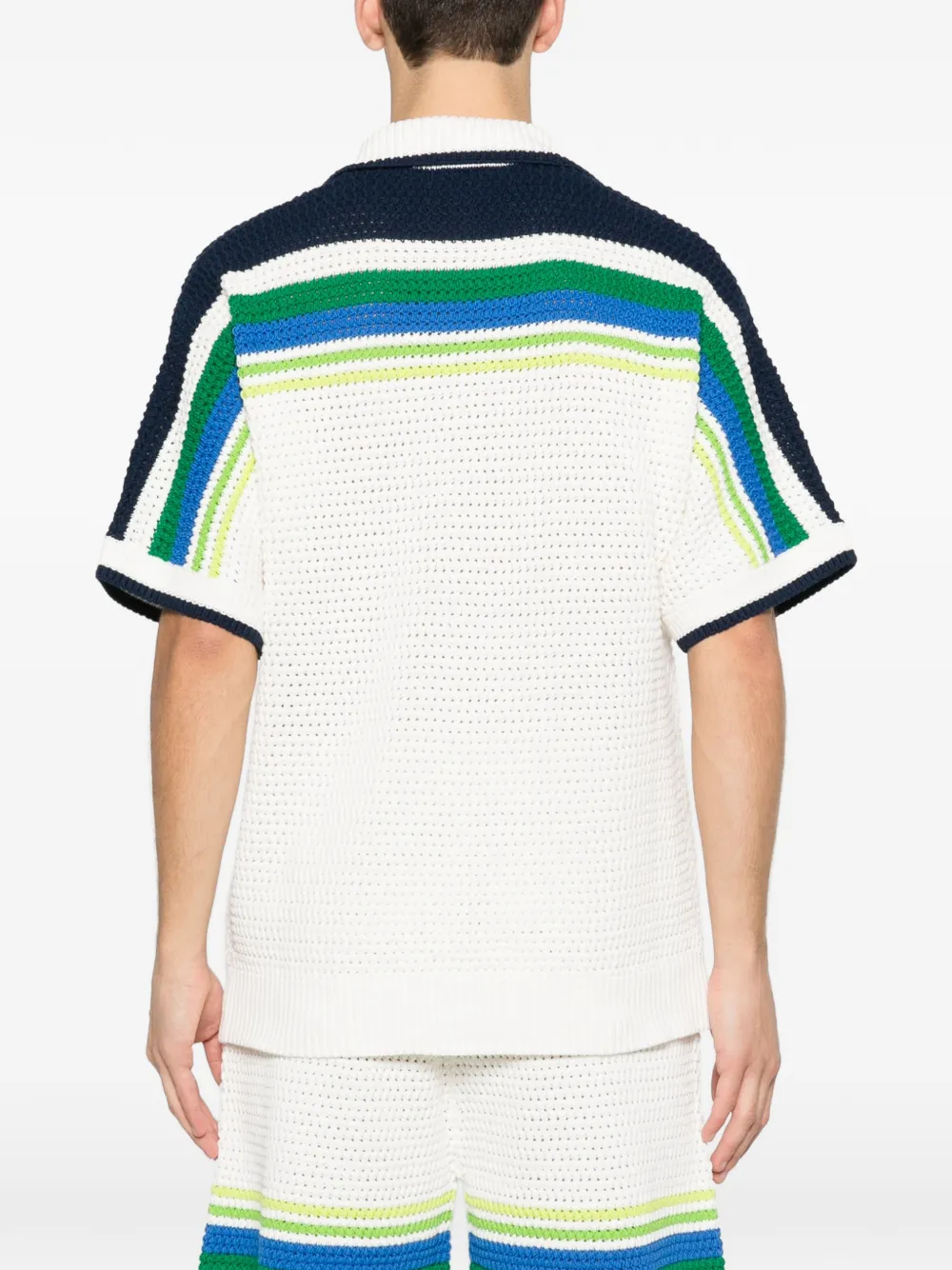 Белая футболка-поло в полоску с вышивкой, короткими рукавами, застежкой на пуговицы спереди и воротником пола