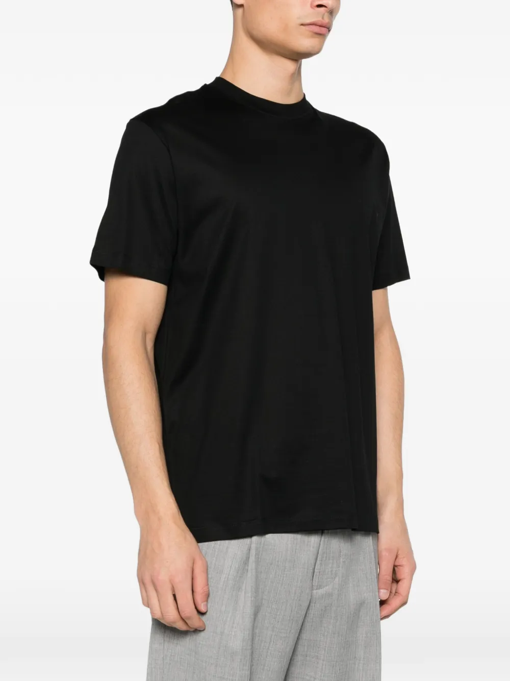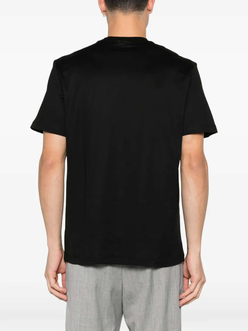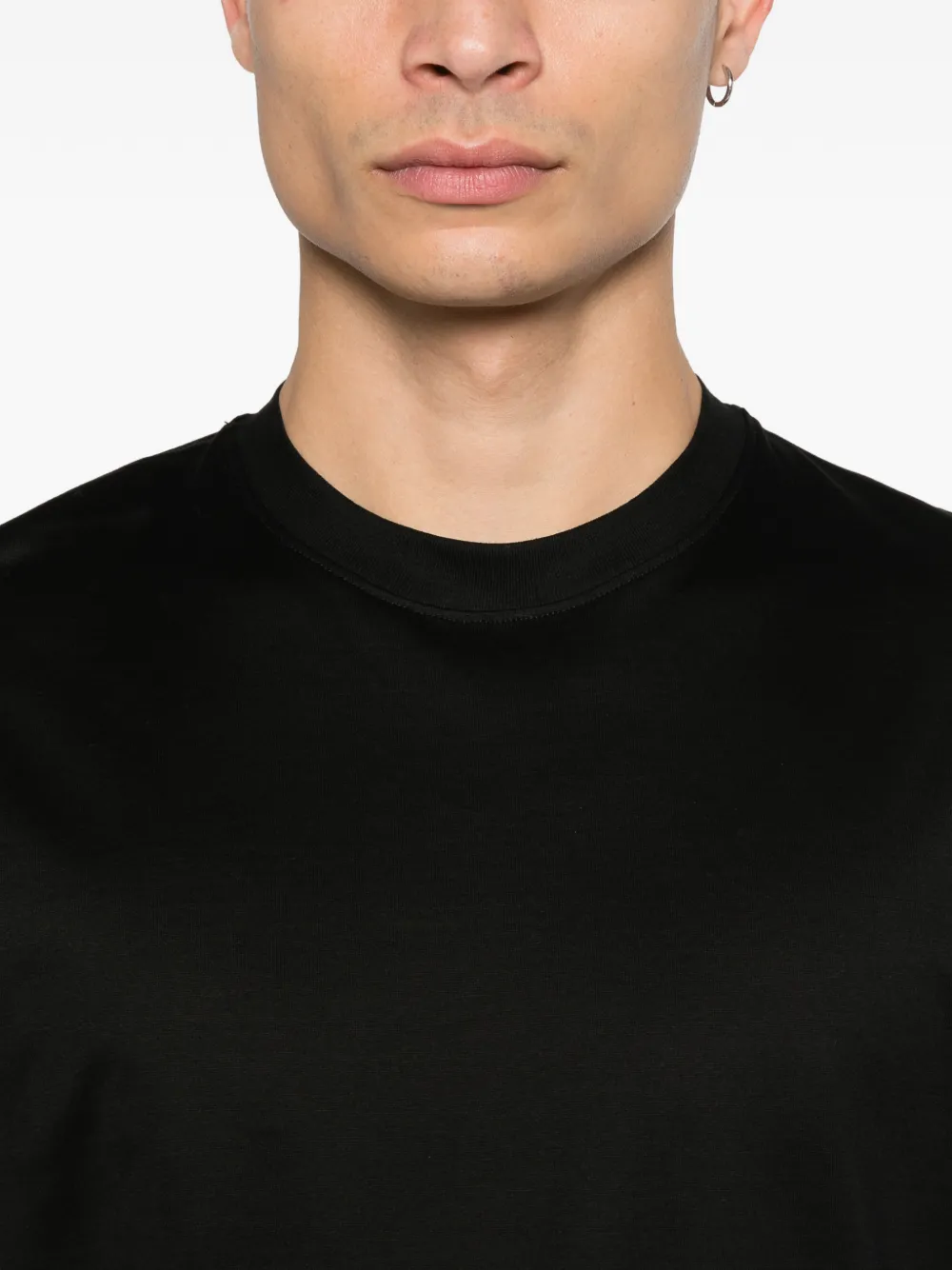 Черная футболка с круглым вырезом, короткими рукавами, прямым подолом, тональной прострочкой и горизонтальным швом