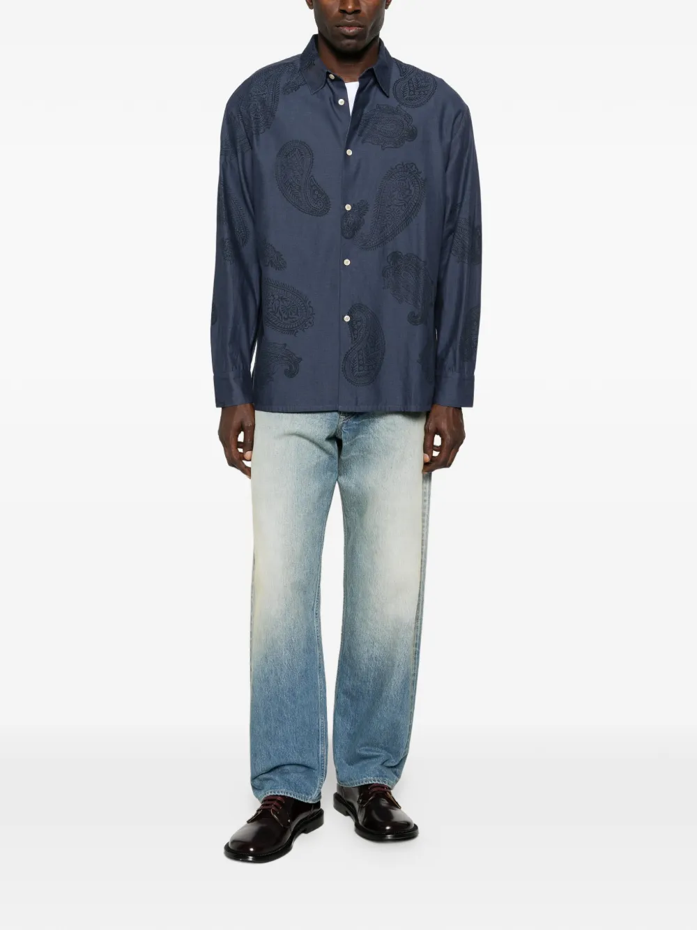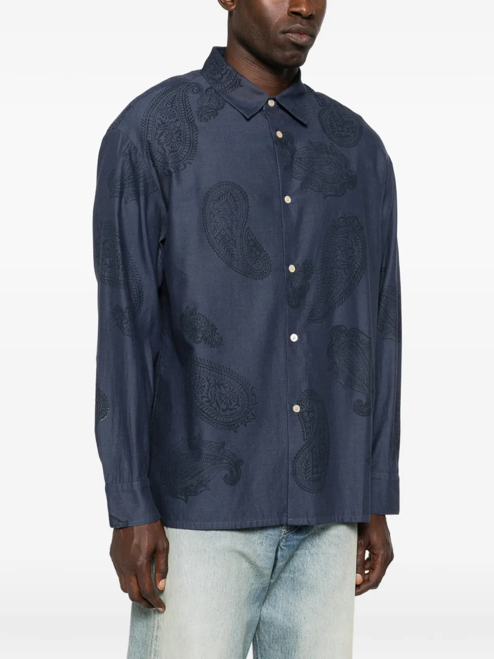 Голубая рубашка с принтом «пейсли», застежкой на пуговицах, длинными рукавами и острым воротником