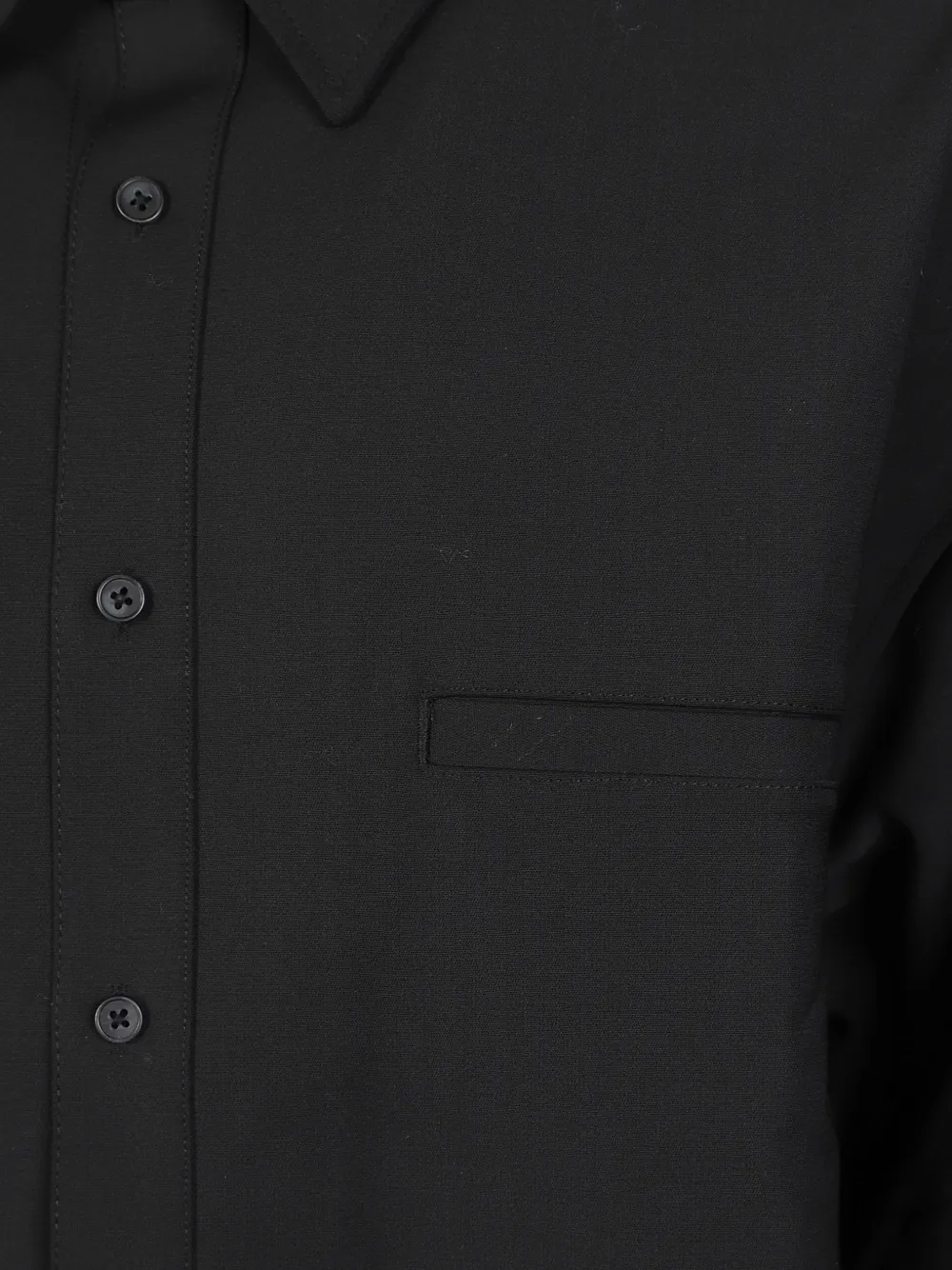 Черная рубашка с застежкой на пуговицы спереди, длинными рукавами с манжетами на пуговицах, накладным карманом на груди и классическим воротником