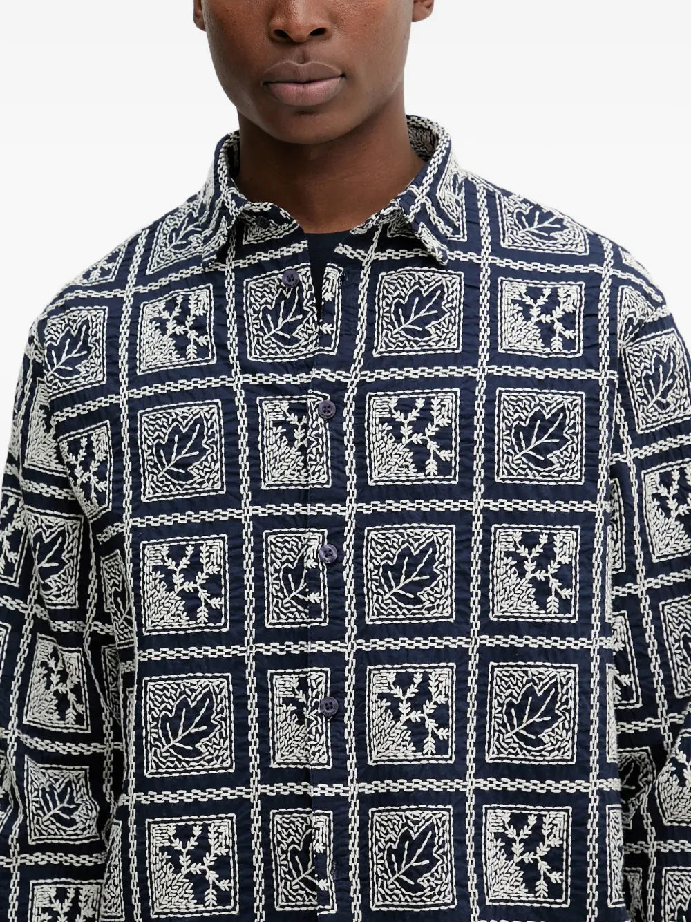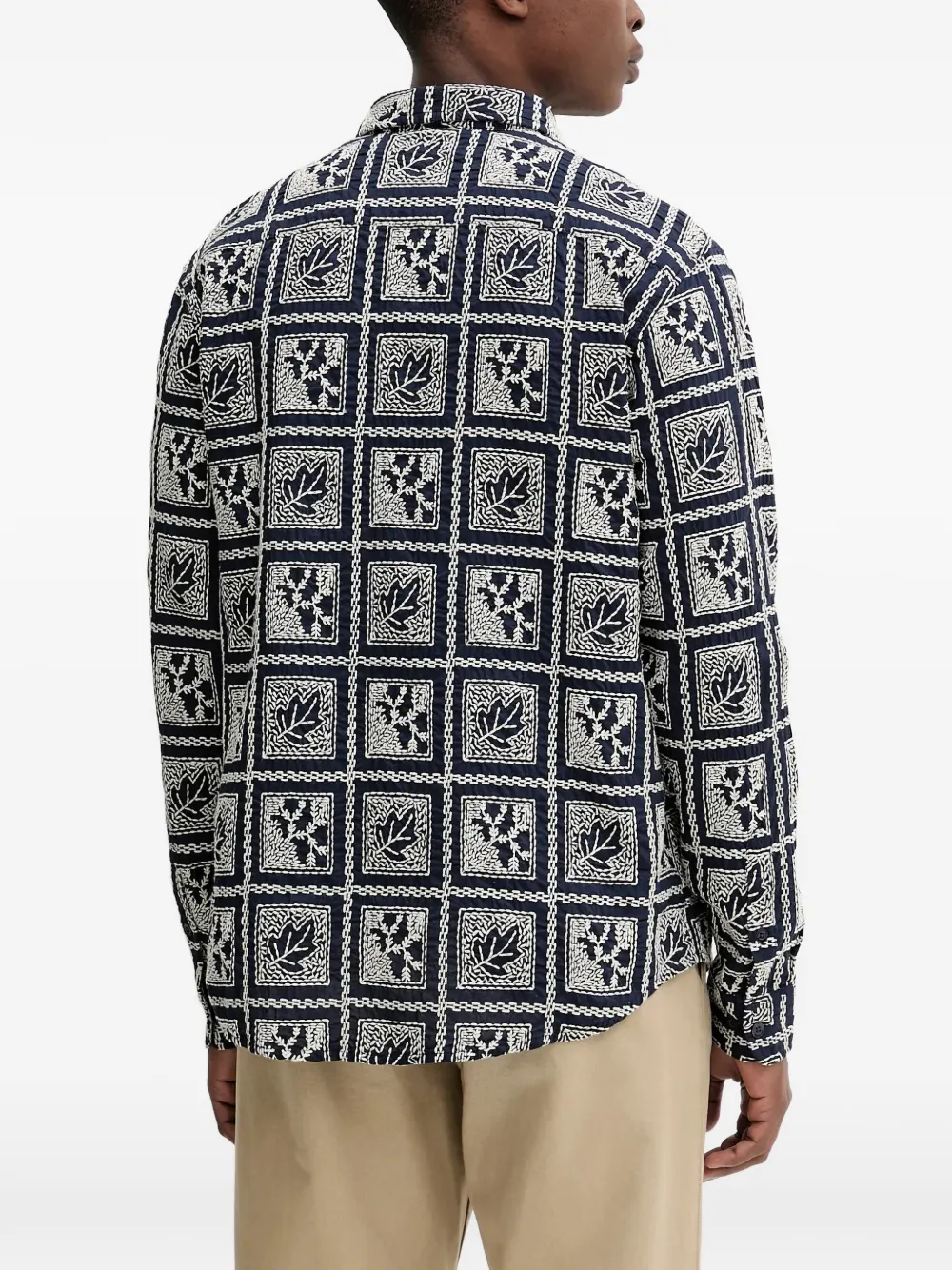 Темно-синяя рубашка с листовым узором, воротник-спред, застежка на пуговицы, длинные рукава, манжеты на пуговицах