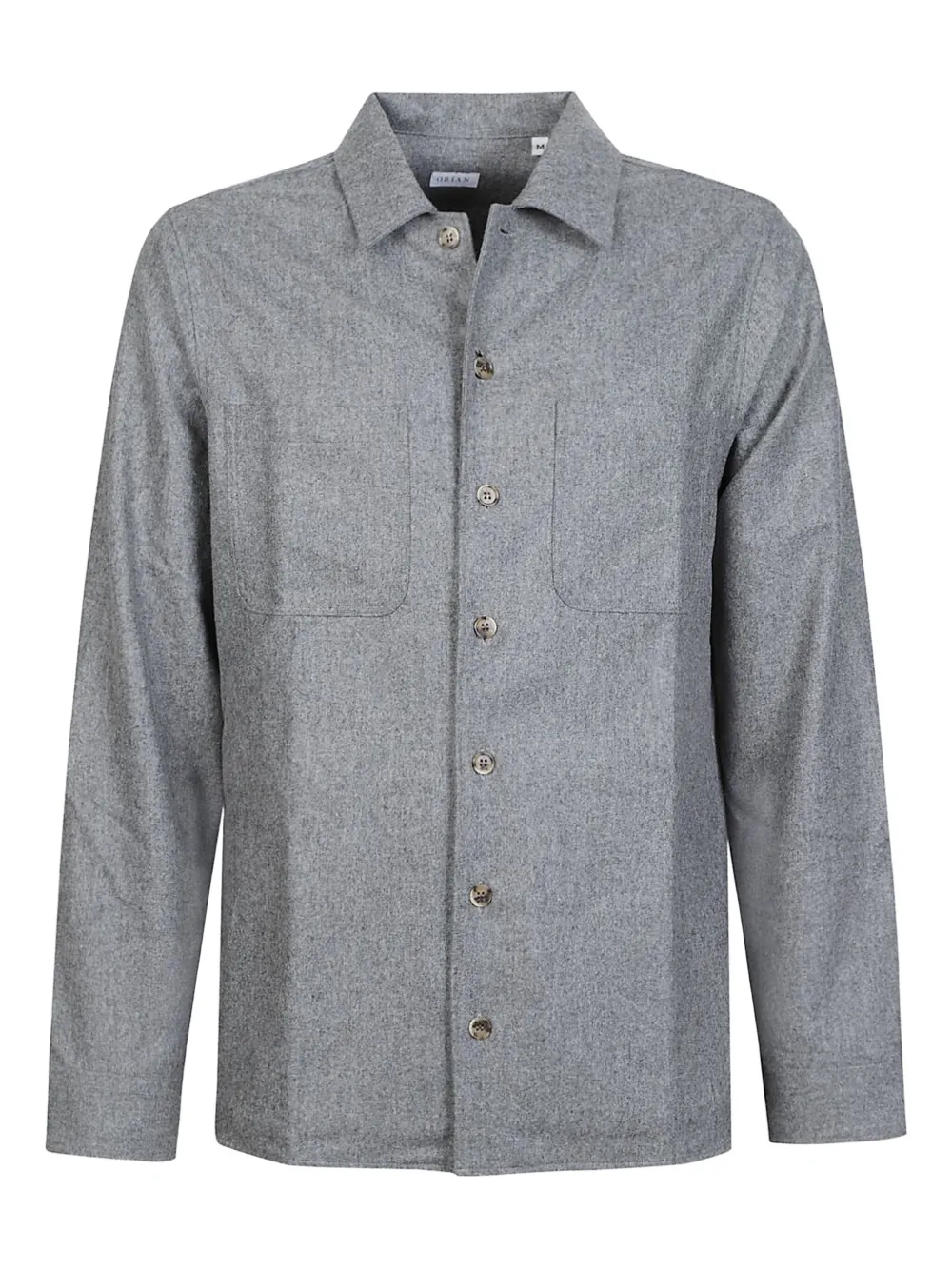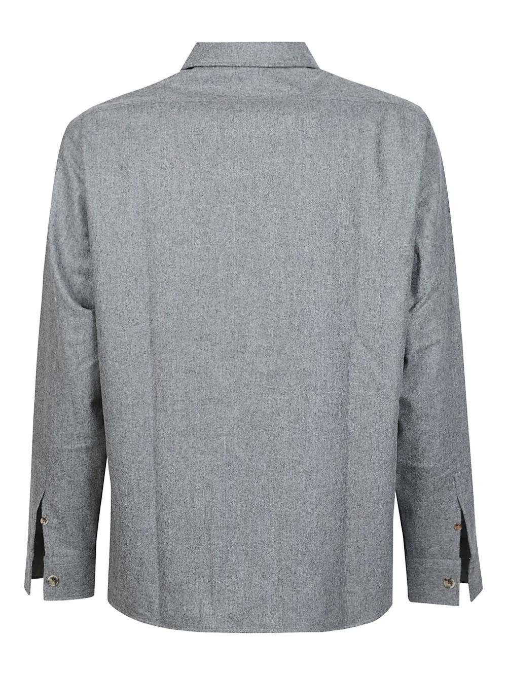 Серый шерстяной материал, длинные рукава, застежка на пуговицы, нагрудные карманы