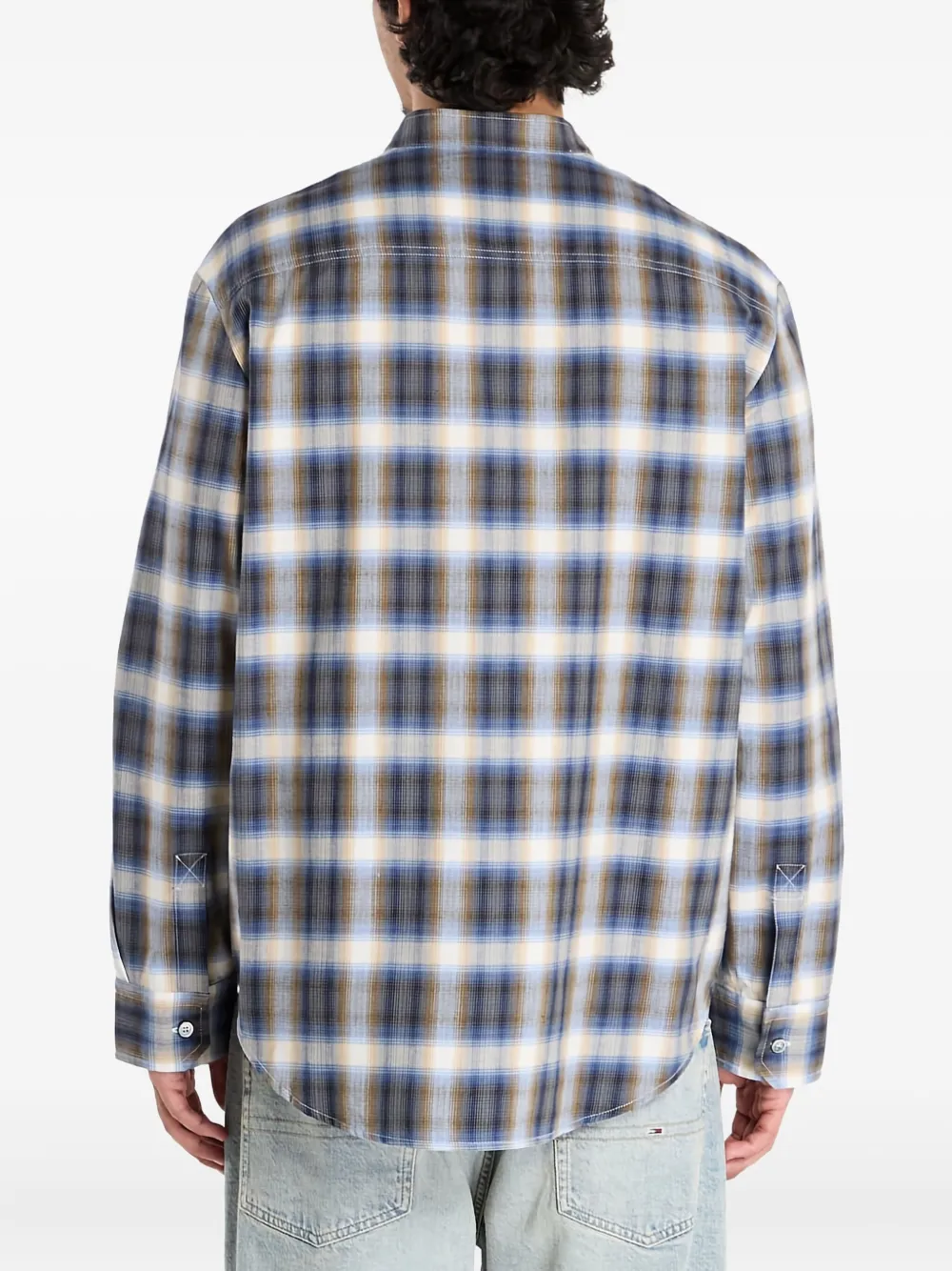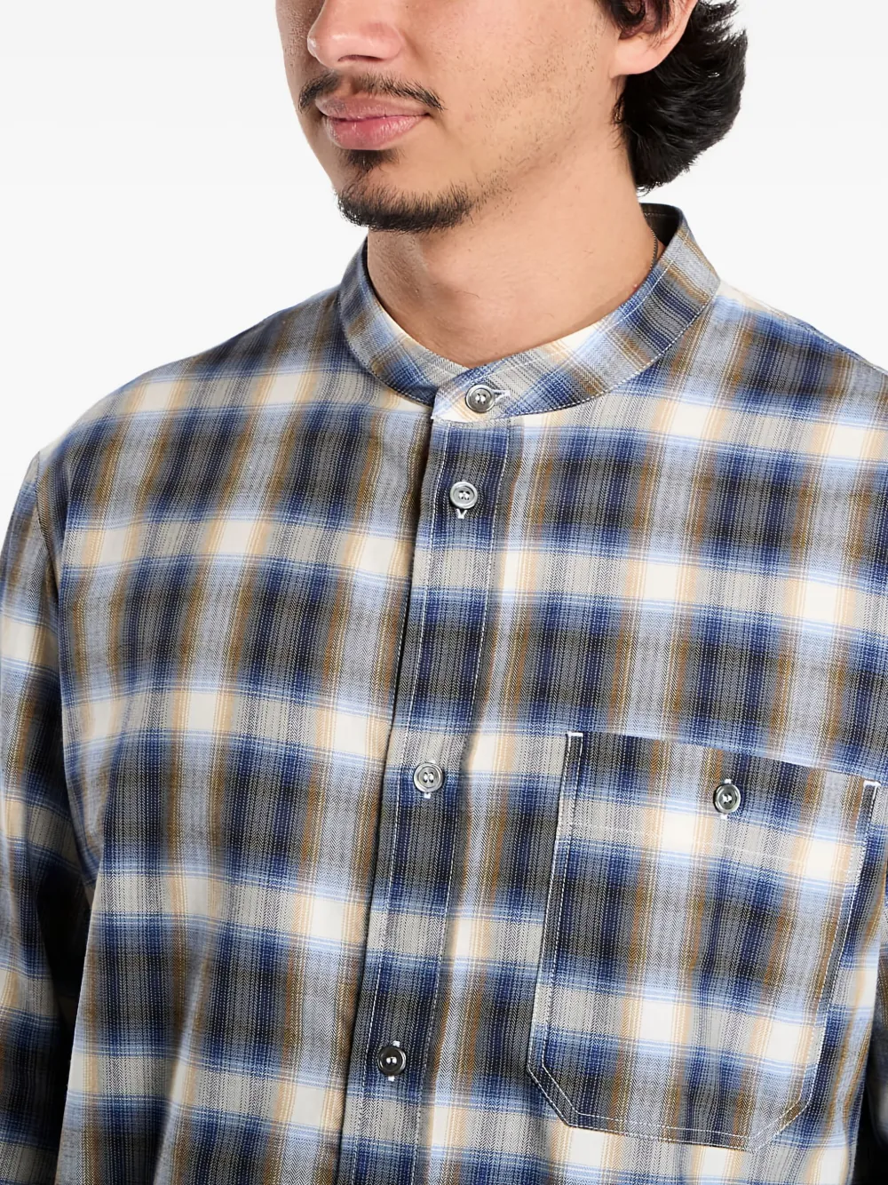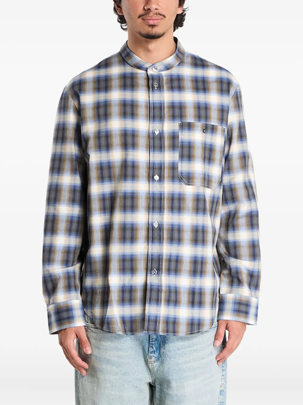 Синий в клетку, воротник-стойка, нагрудный карман, застежка на пуговицы, длинные рукава