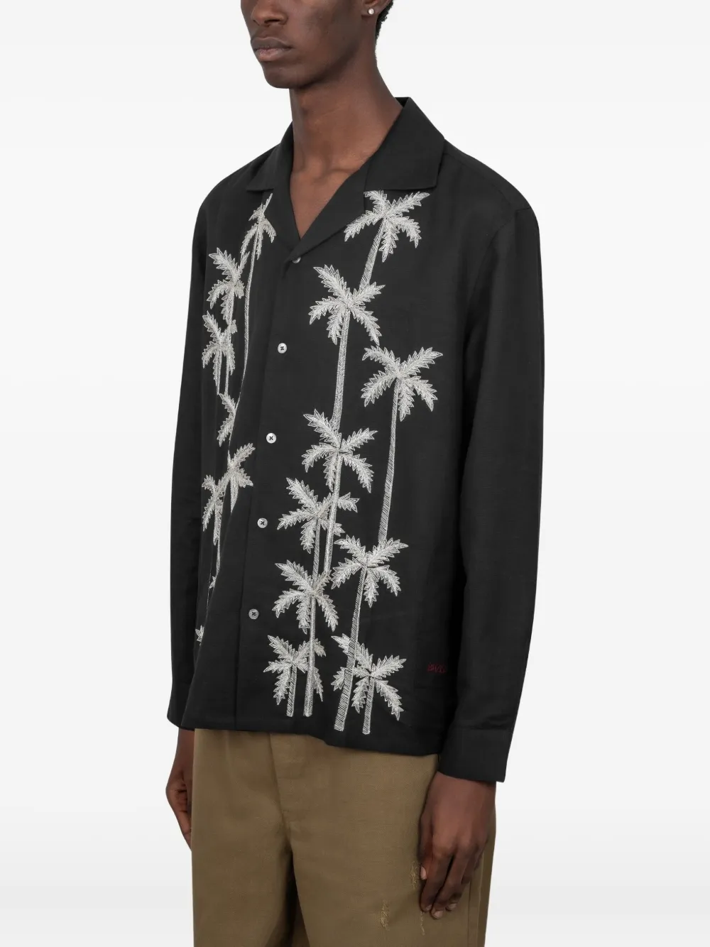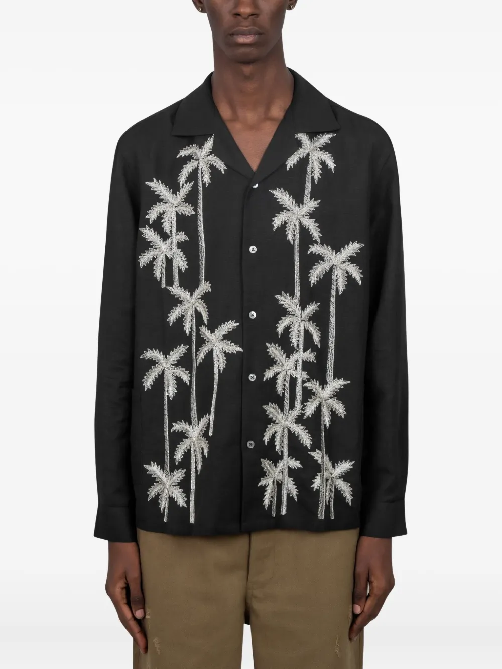 Черная рубашка с вышивкой в виде пальмы, воротник-ревер, длинные рукава, застежка на пуговицы, нагрудный карман