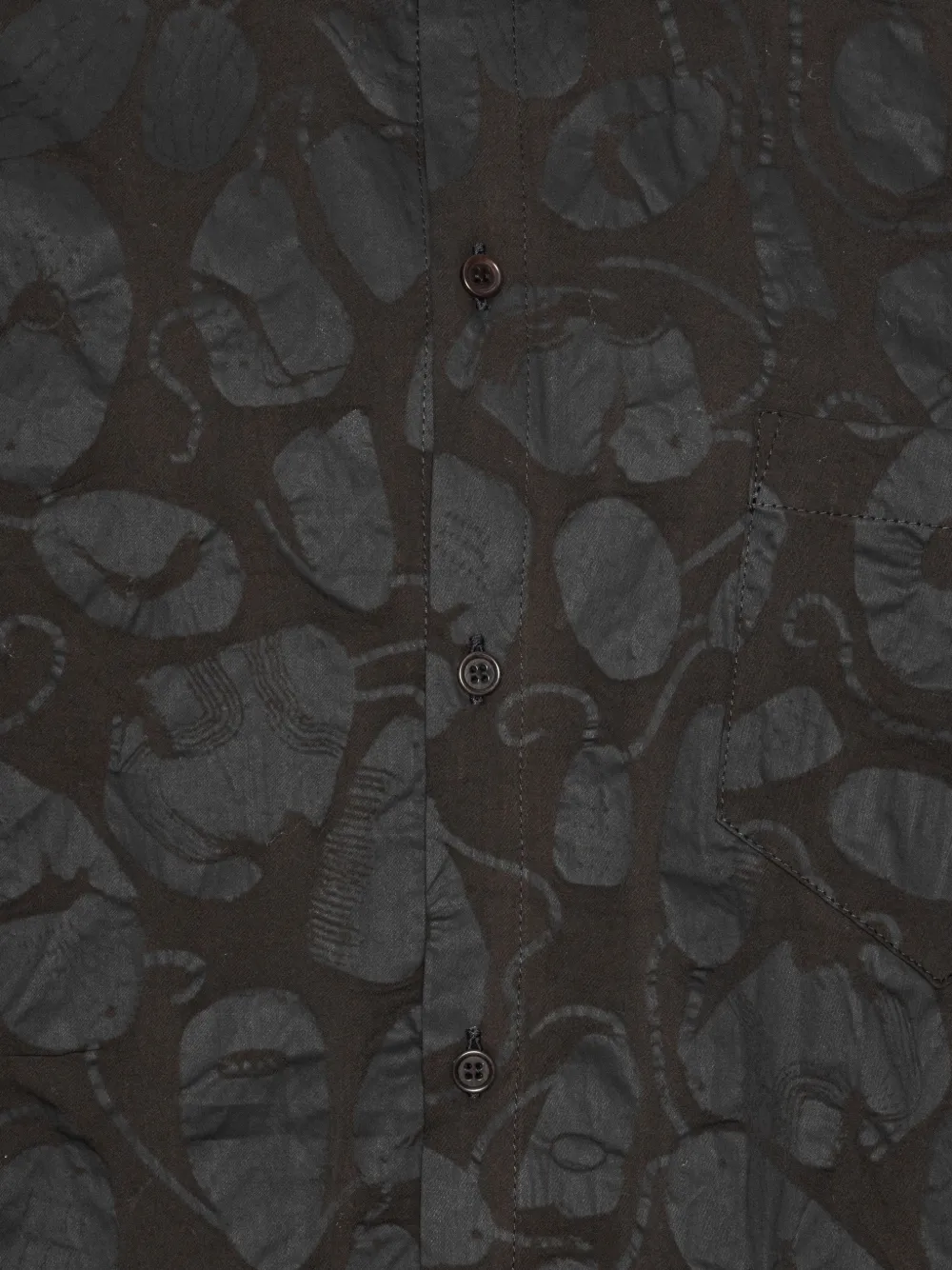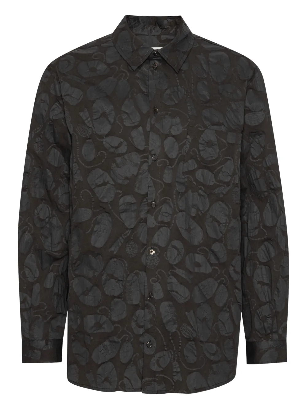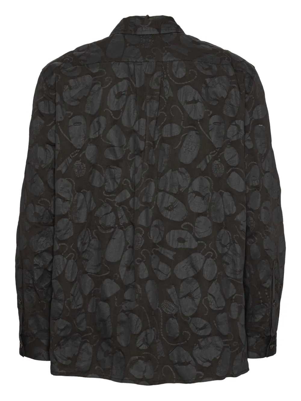 Черный цвет, полностью покрытый узором, нагрудный карман, застежка на пуговицы, длинные рукава, манжеты на пуговицах