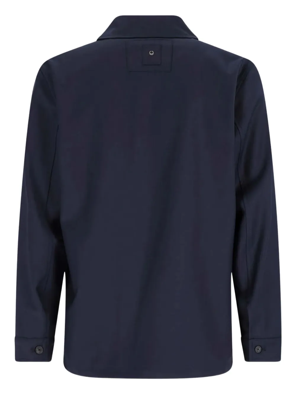 Голубая рубашка с застежкой на пуговицы, двумя нагрудными карманами, отложным воротником, длинными рукавами и манжетами на пуговицах