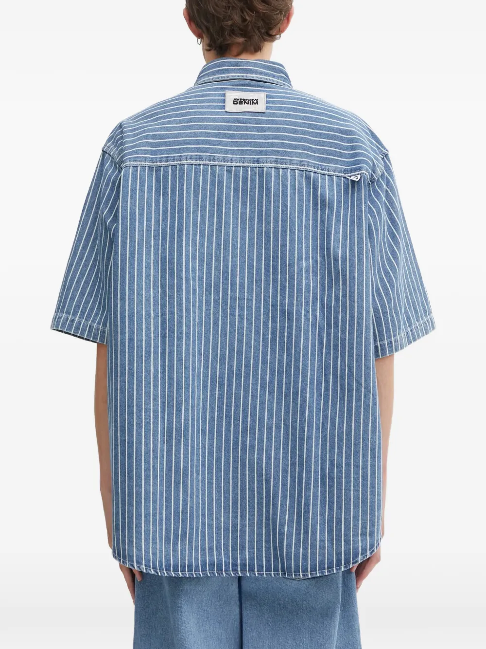 Синяя полосатая рубашка на пуговицах с воротником, нашивкой спереди и короткими рукавами