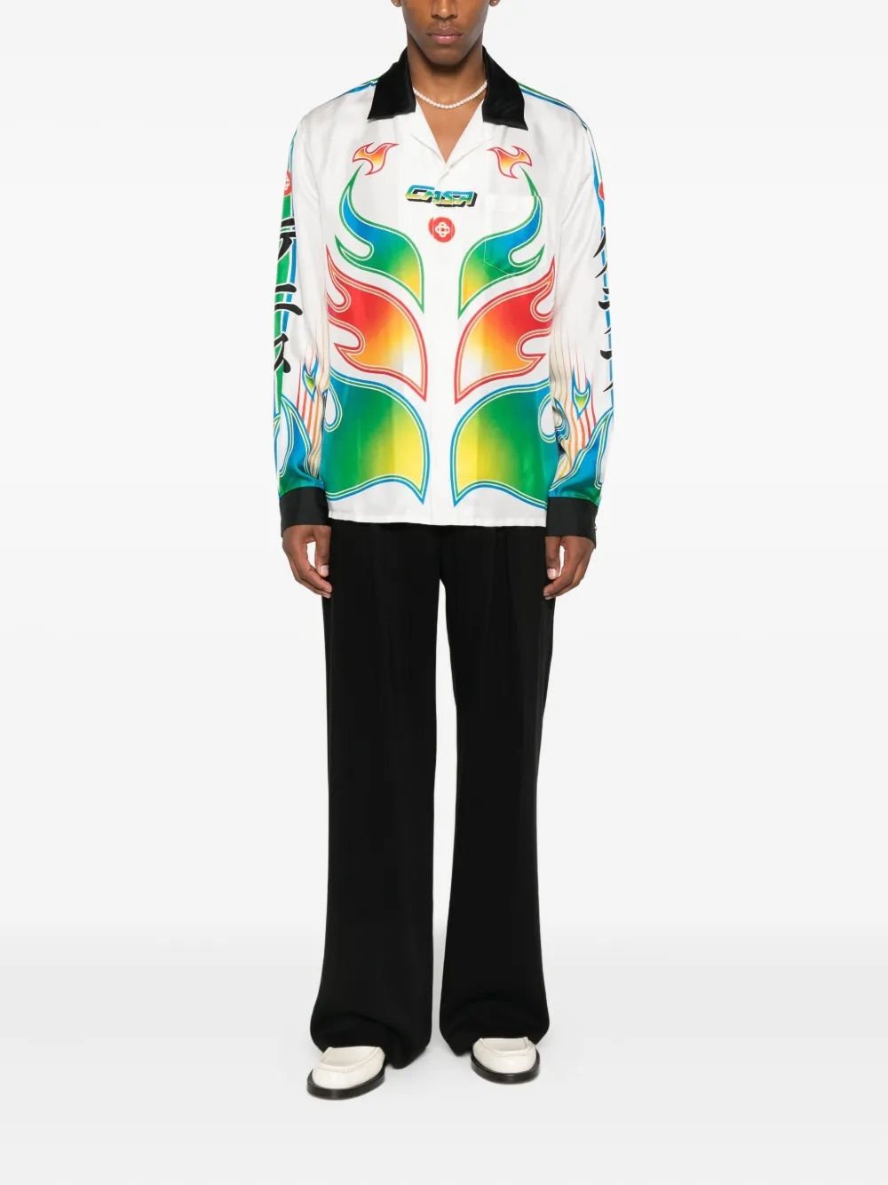 Белый с пламенным узором, длинные рукава, отложной воротник, застежка на пуговицы, графический принт