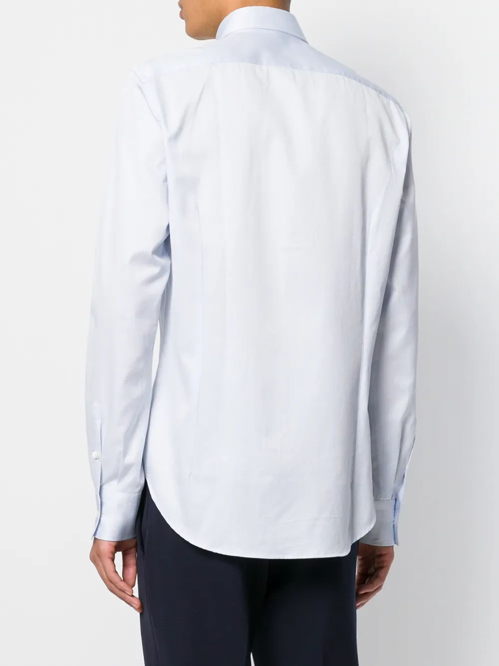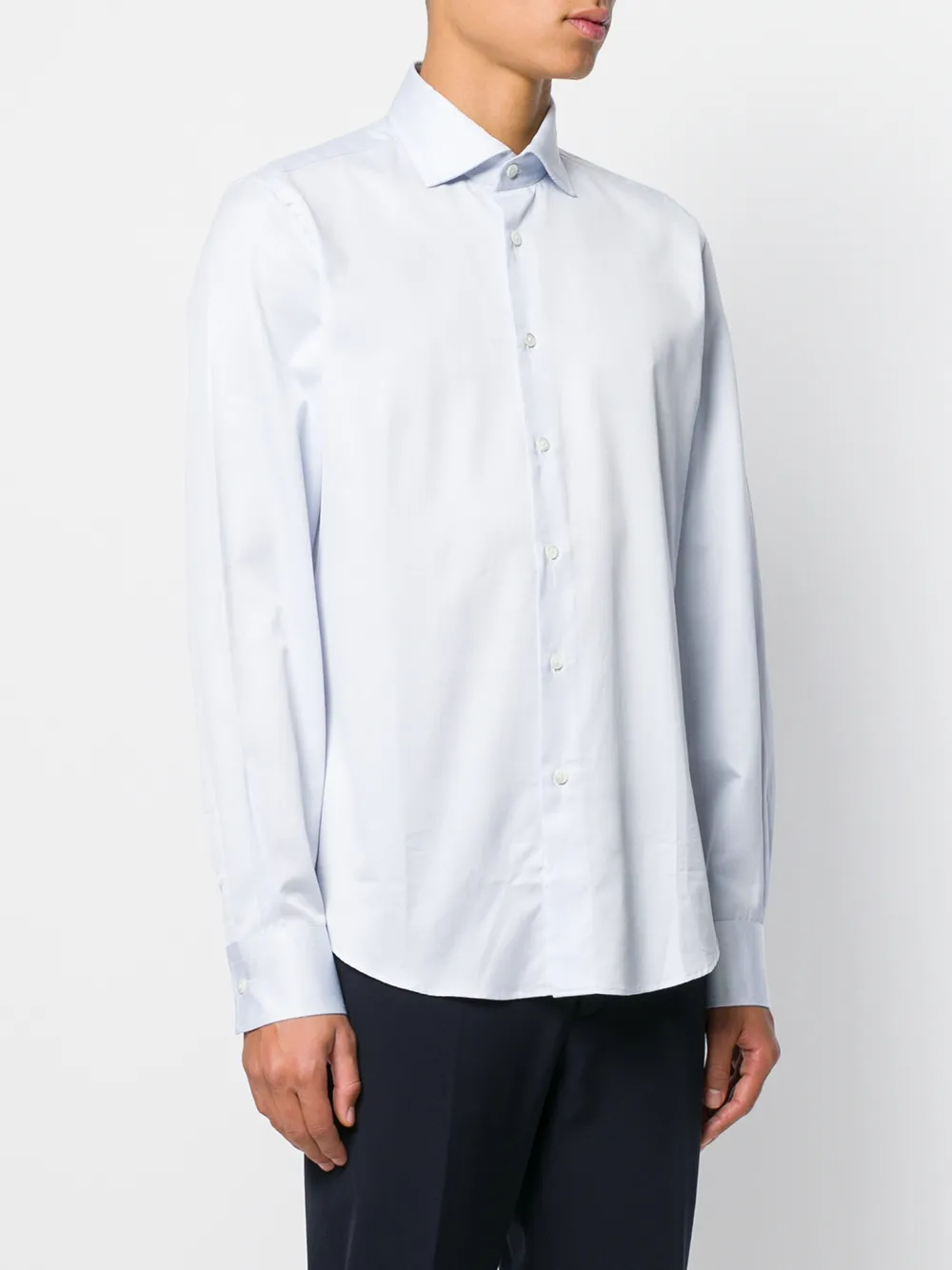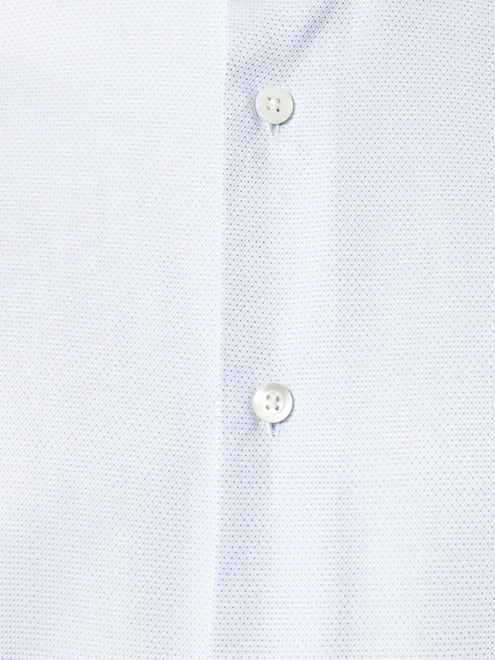 Белая хлопковая рубашка в горошек от Dell'oglio. Косой воротник, длинные рукава, застежка на пуговицах спереди, закругленный подол.