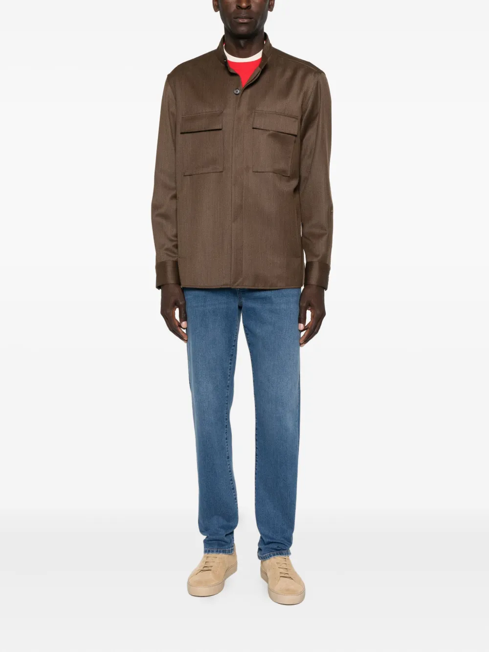 Коричневый классический воротник застежка на пуговицы спереди длинные рукава два нагрудных кармана с клапанами манжеты на пуговицах
