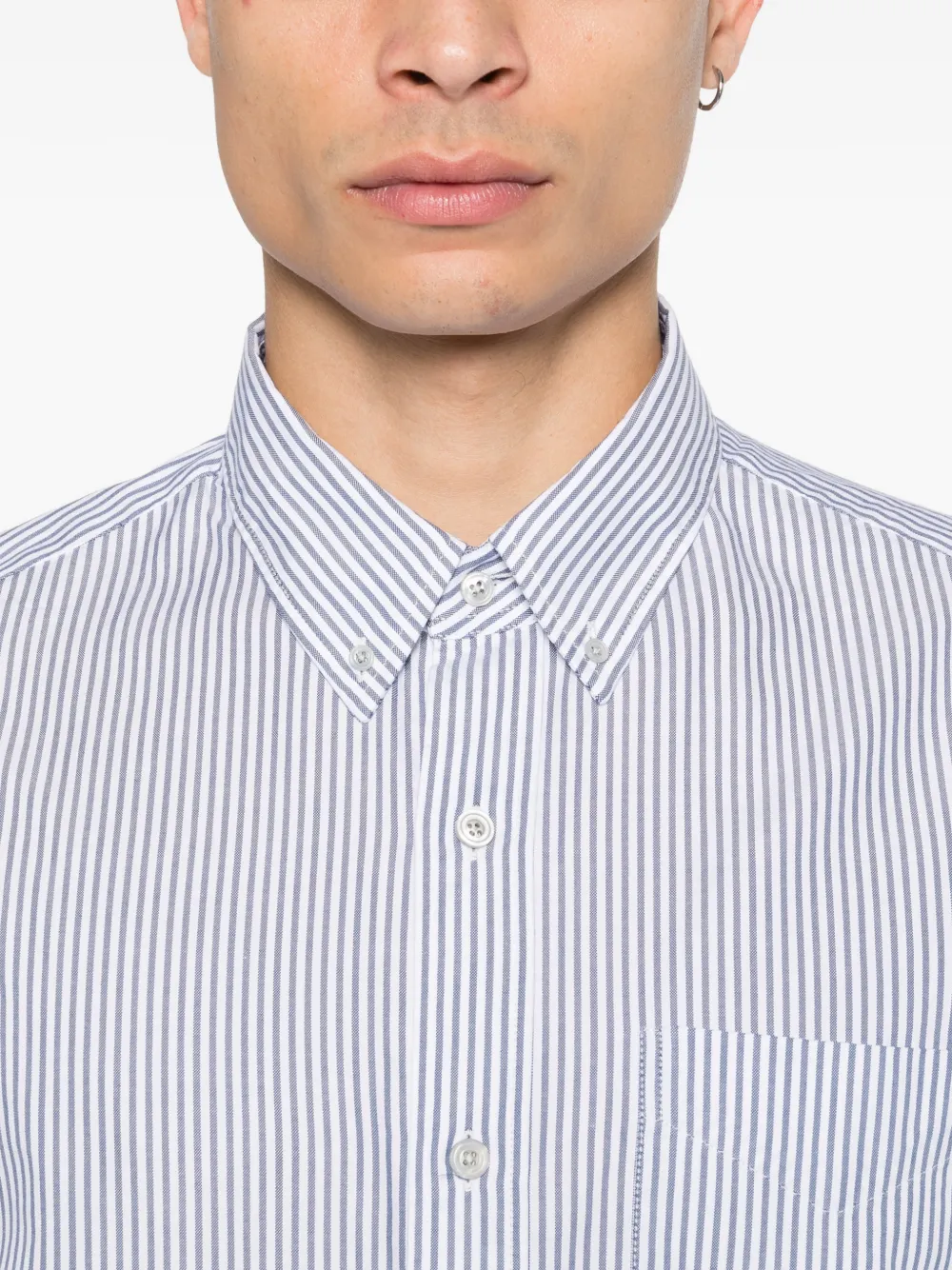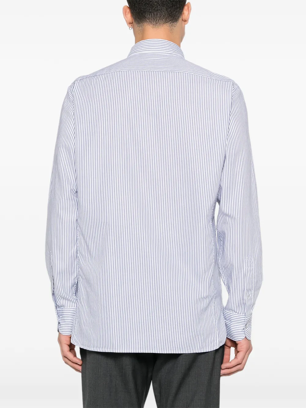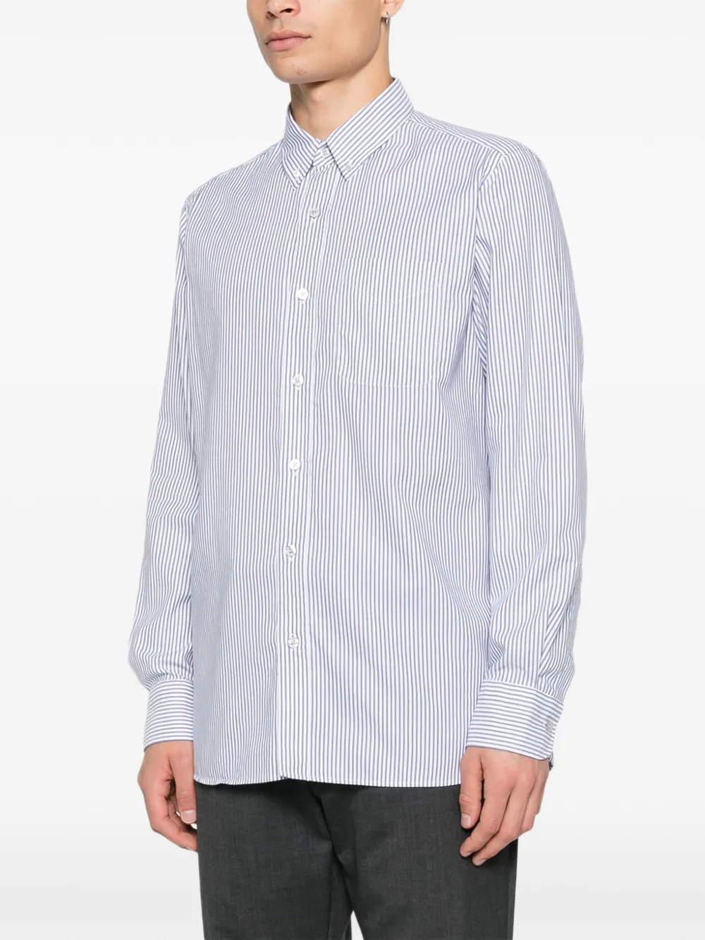 Белая рубашка в вертикальную полоску с застежкой на пуговицы, нагрудным карманом, длинными рукавами и манжетами на пуговицах
