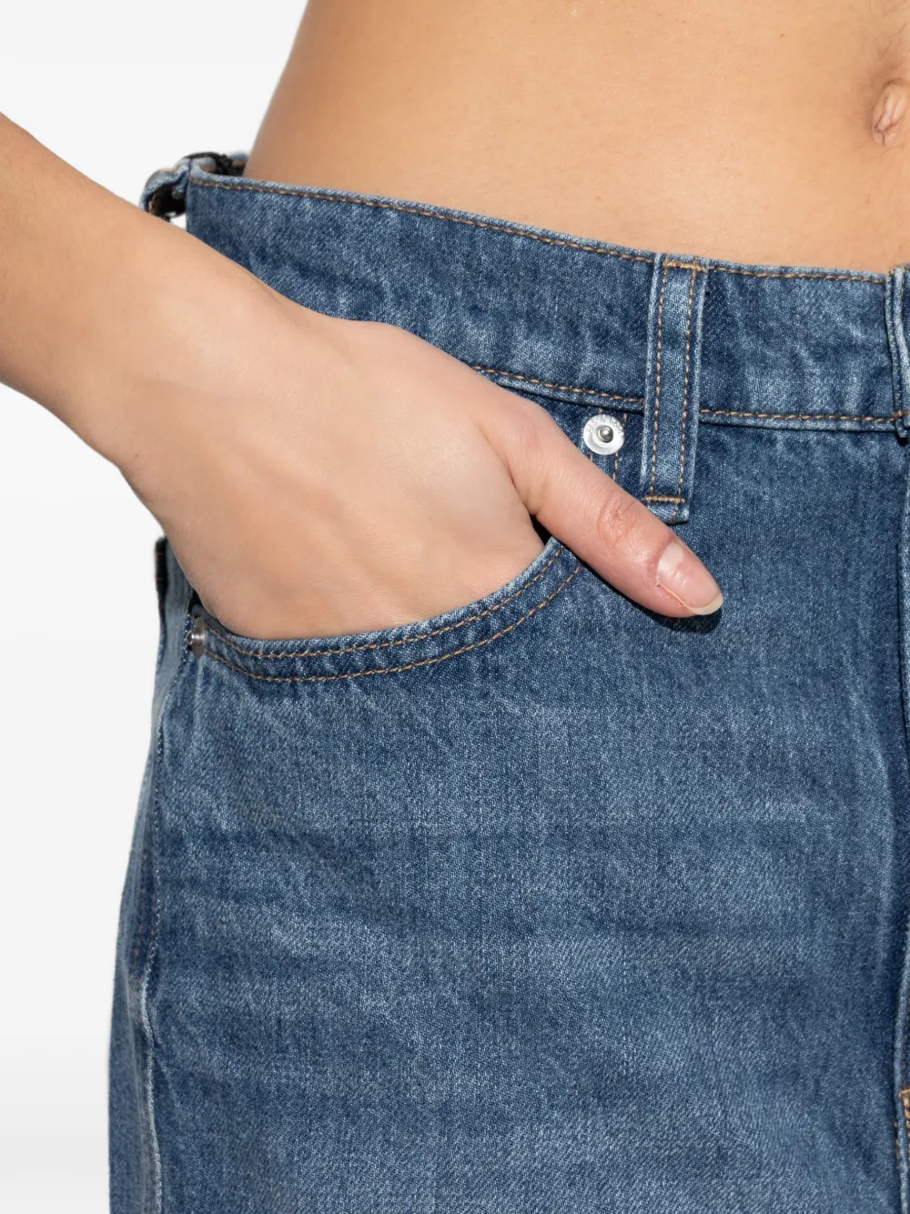 Синие прямые брючины, шлевки для ремня, пять карманов, контрастная прострочка