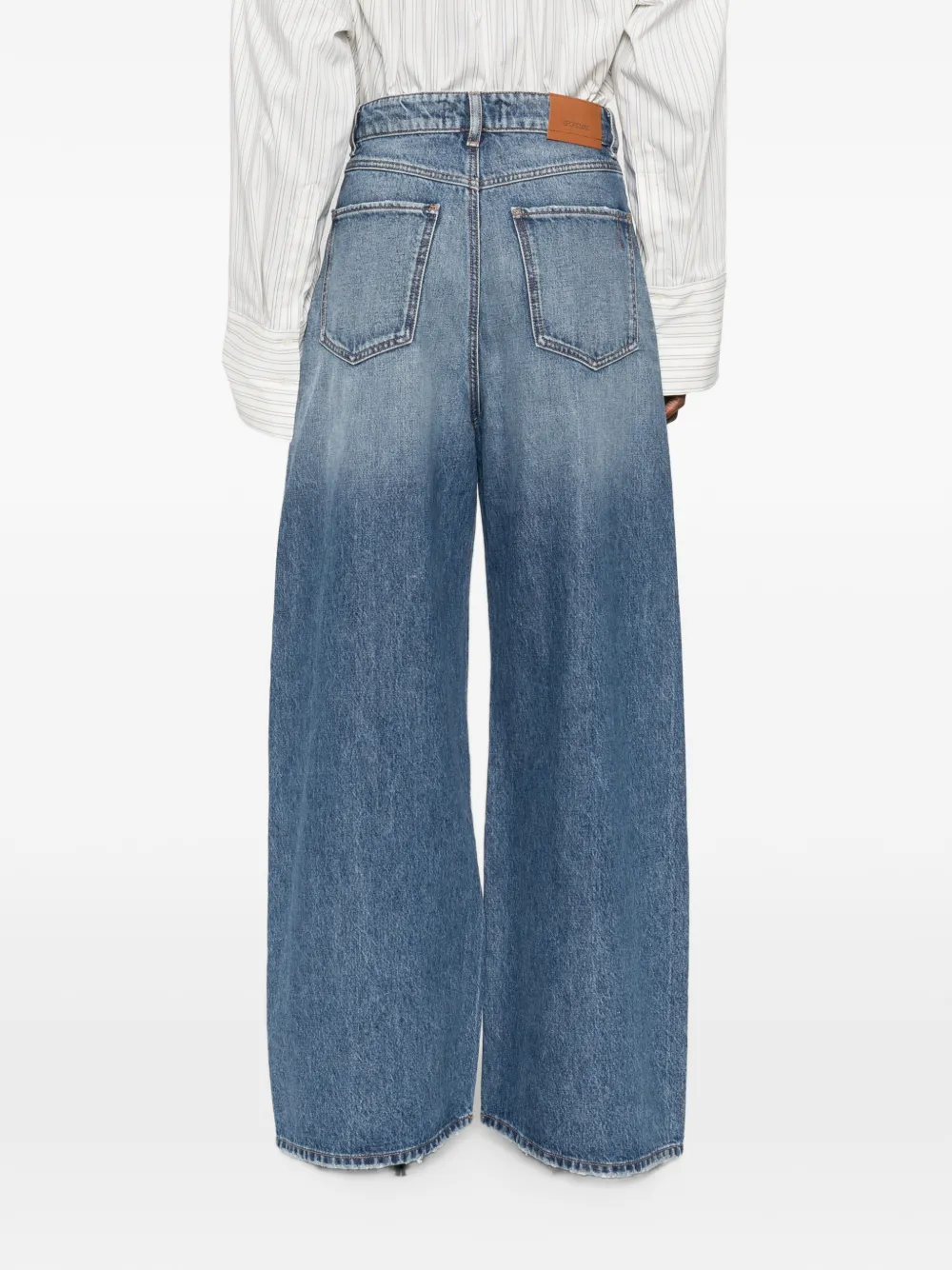 Синие широкие брюки, пять карманов, скрытая застежка на молнию и пуговицу