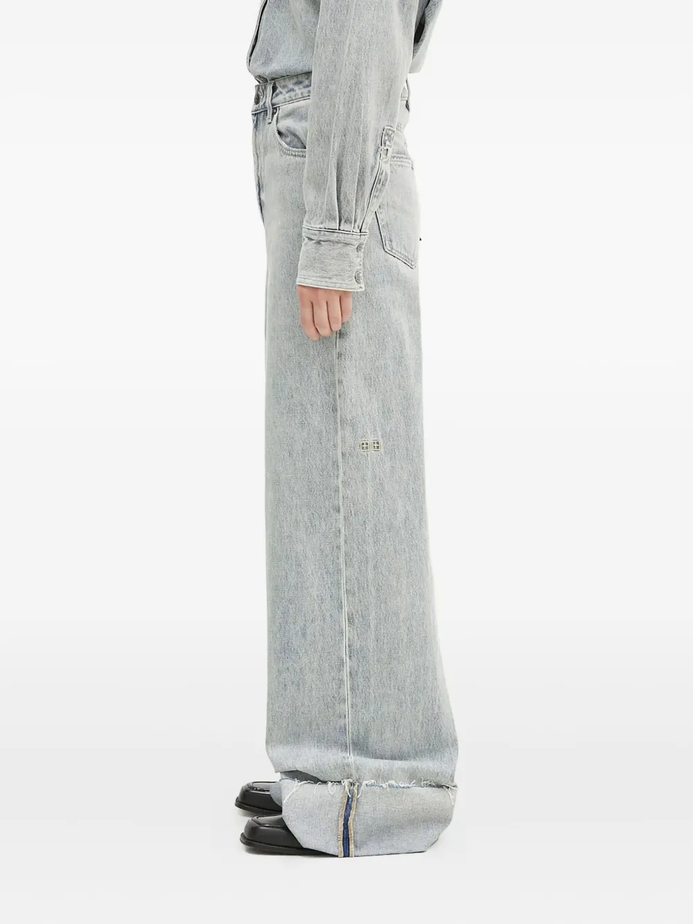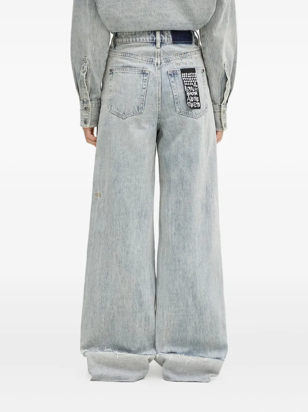 Светло-голубые с нашивкой, пять карманов, шлевки для ремня, подвернутый край