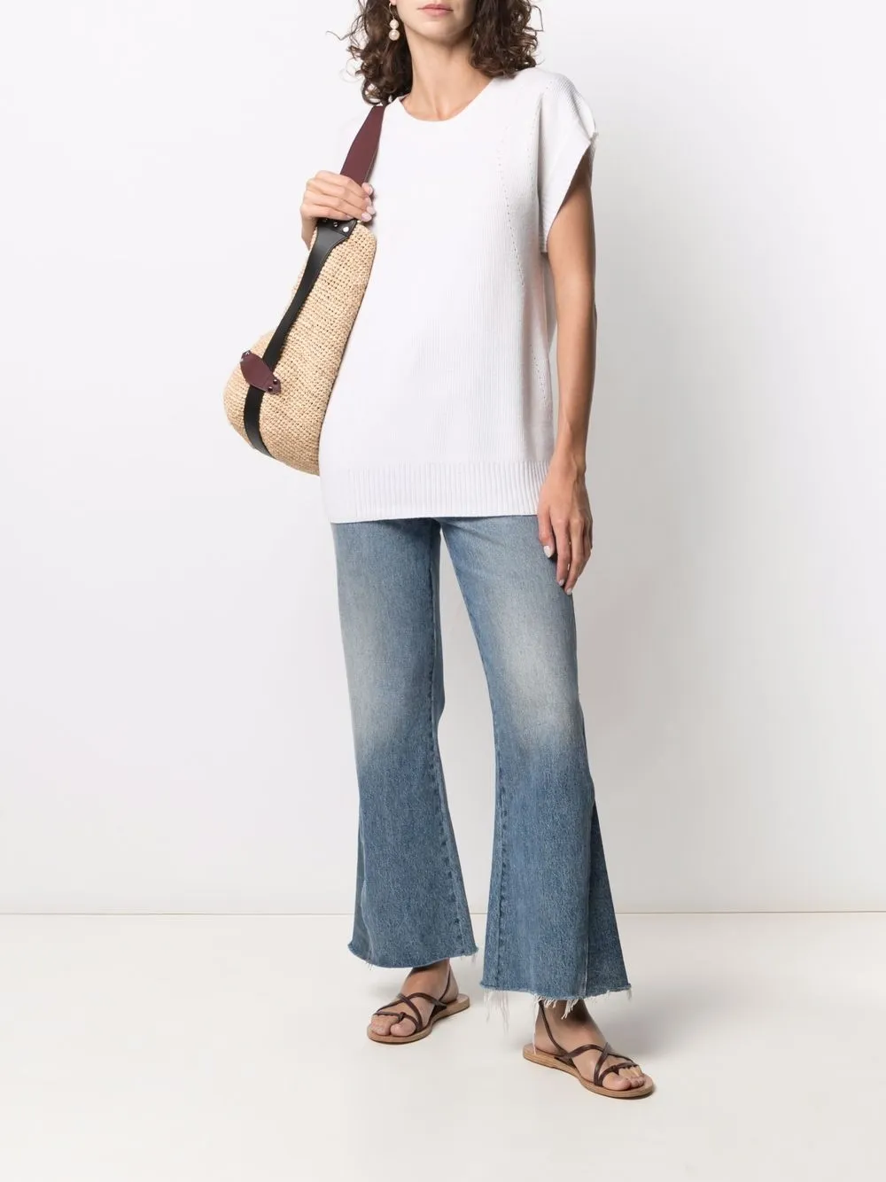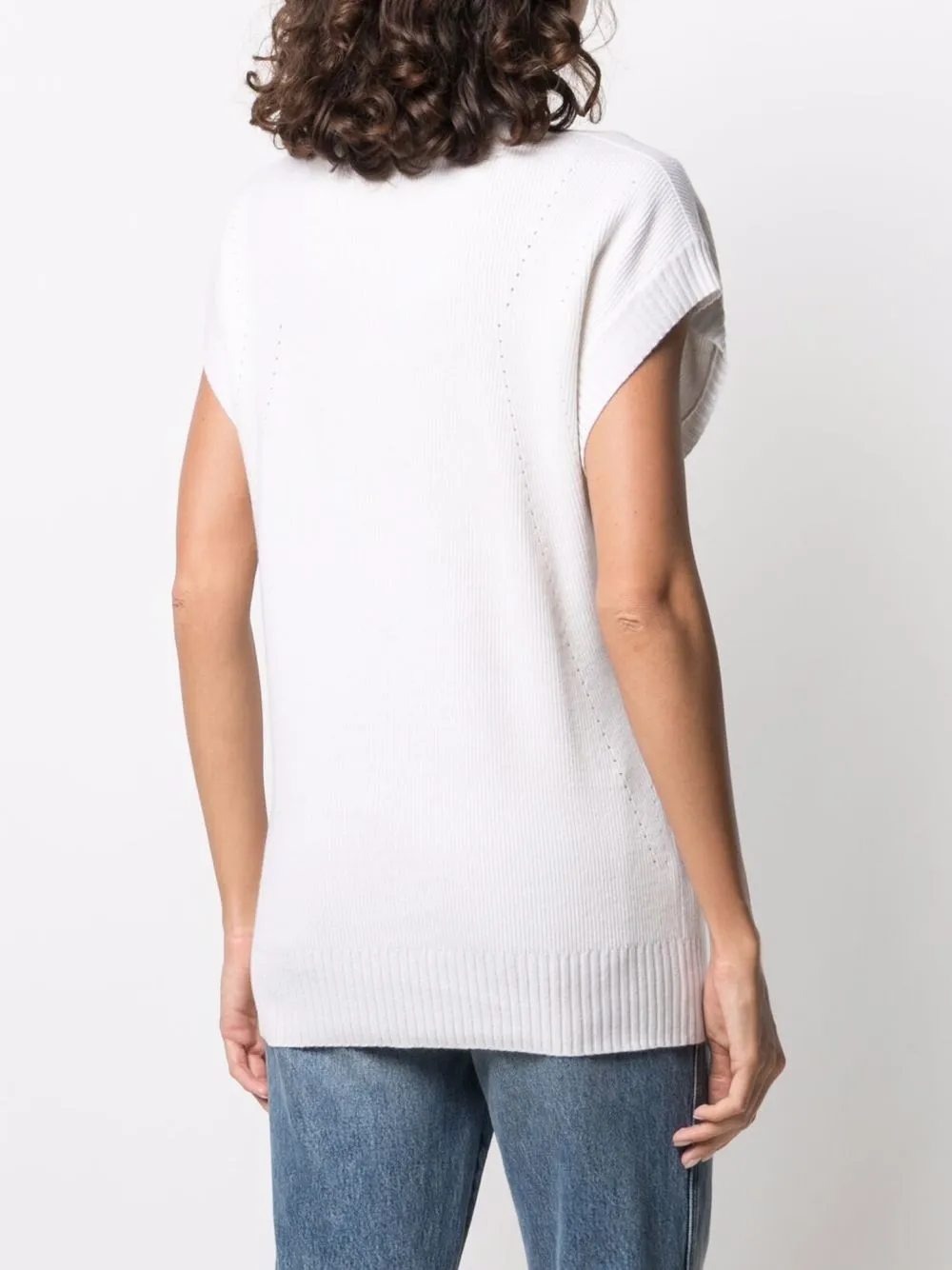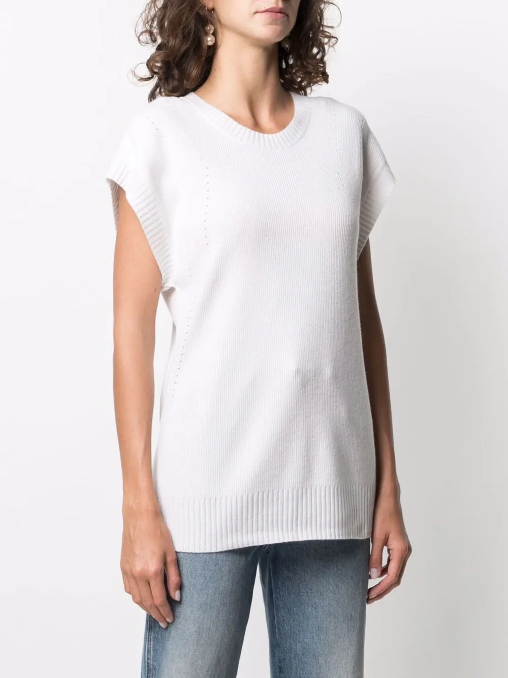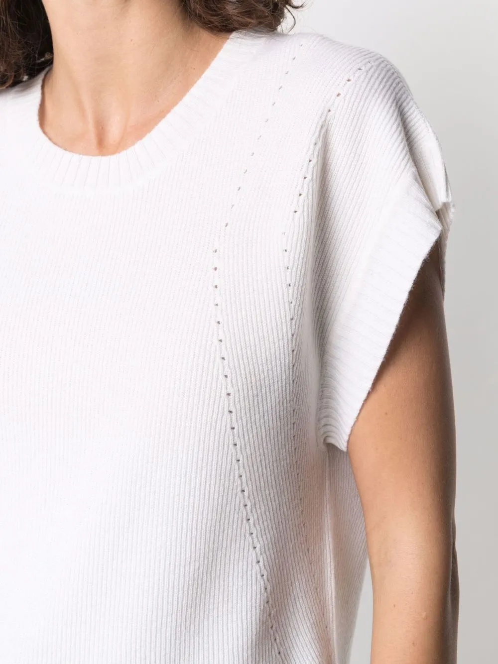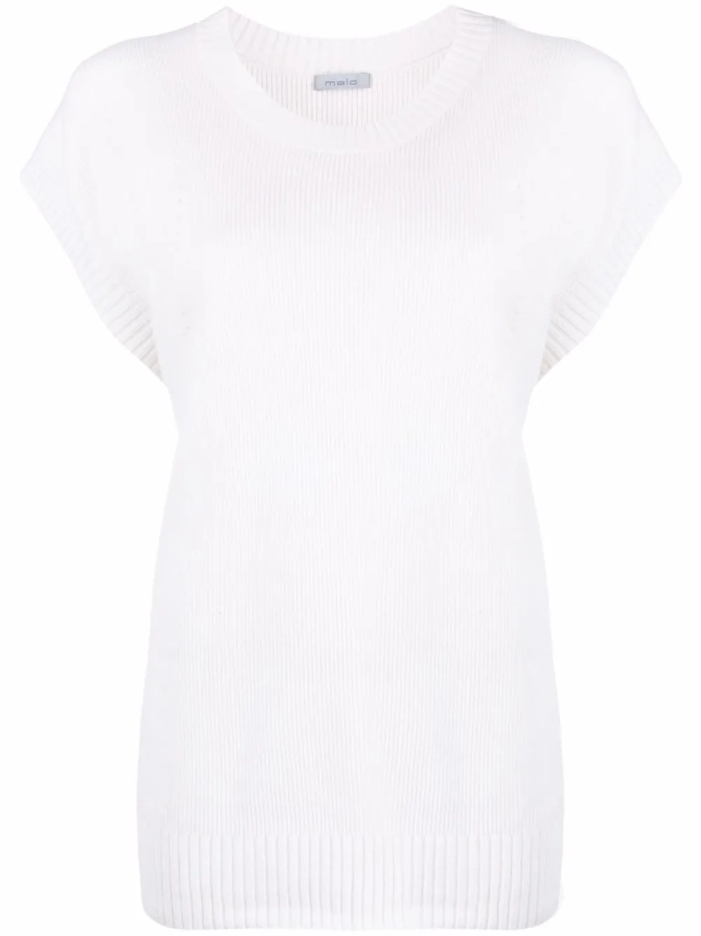Трикотаж в рубчик, короткие рукава с драпировкой и круглый вырез. Цвет: белый.