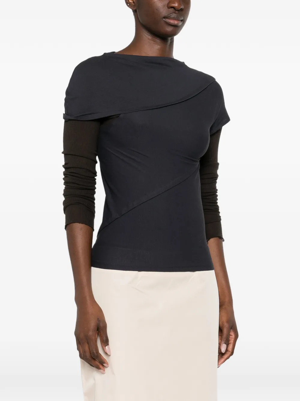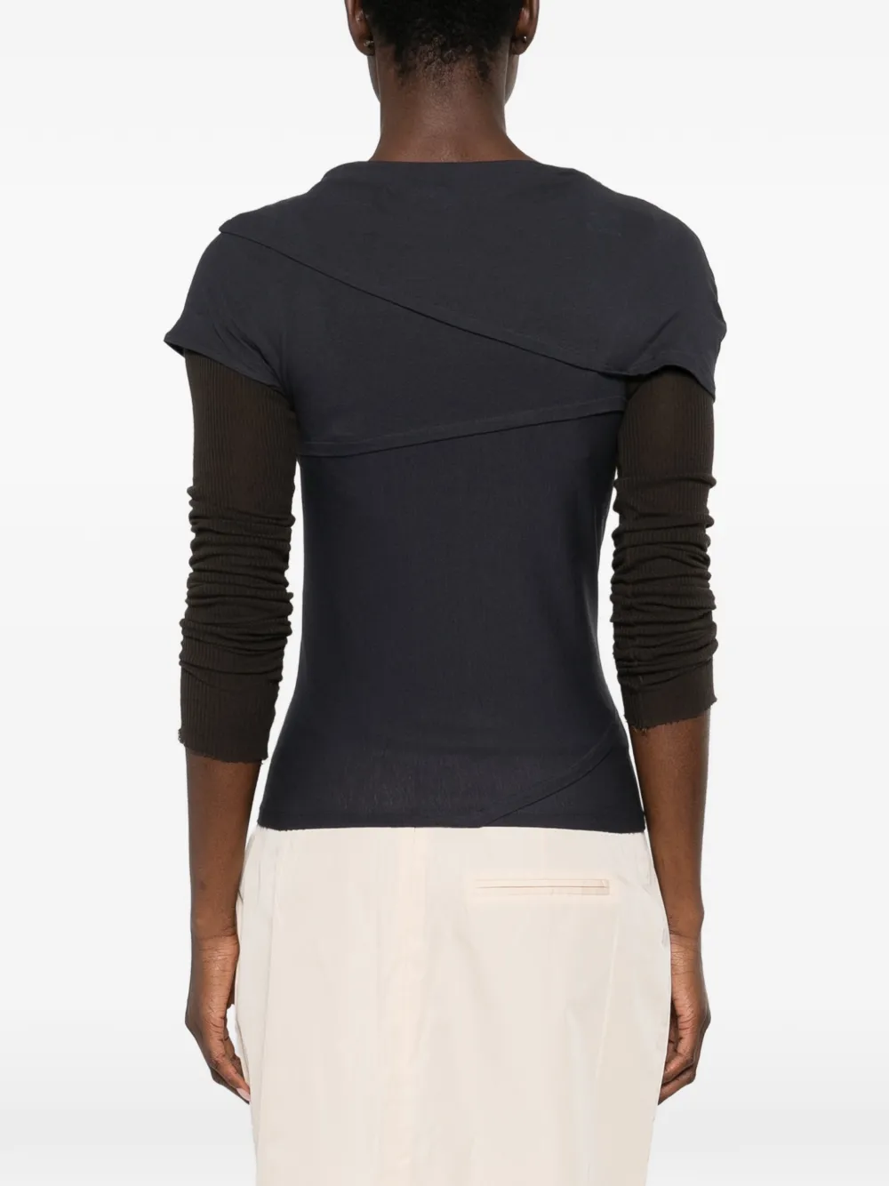 Черный топ с вырезами, короткими рукавами, круглым вырезом и тональной строчкой