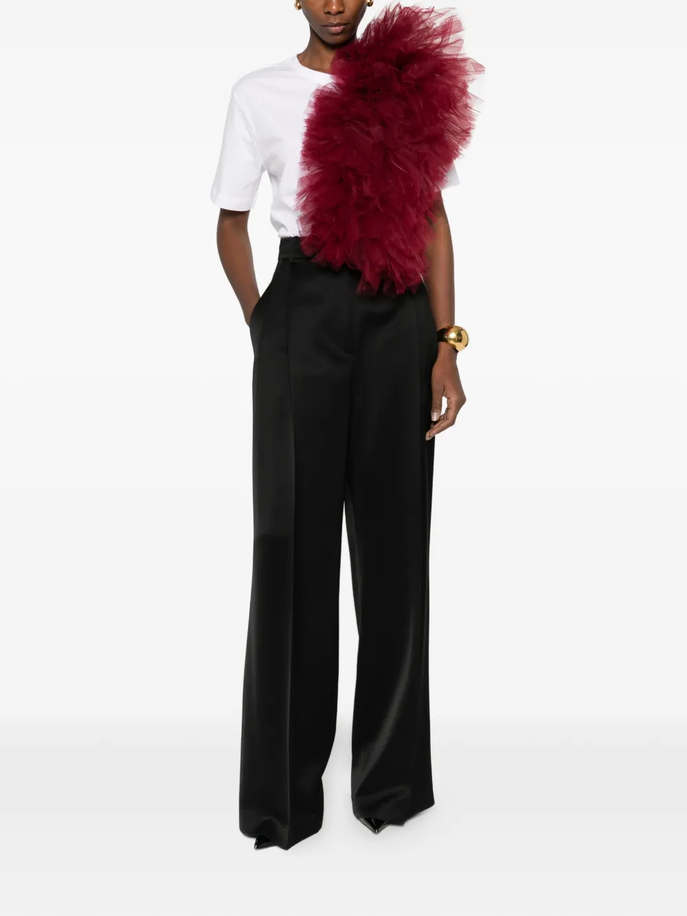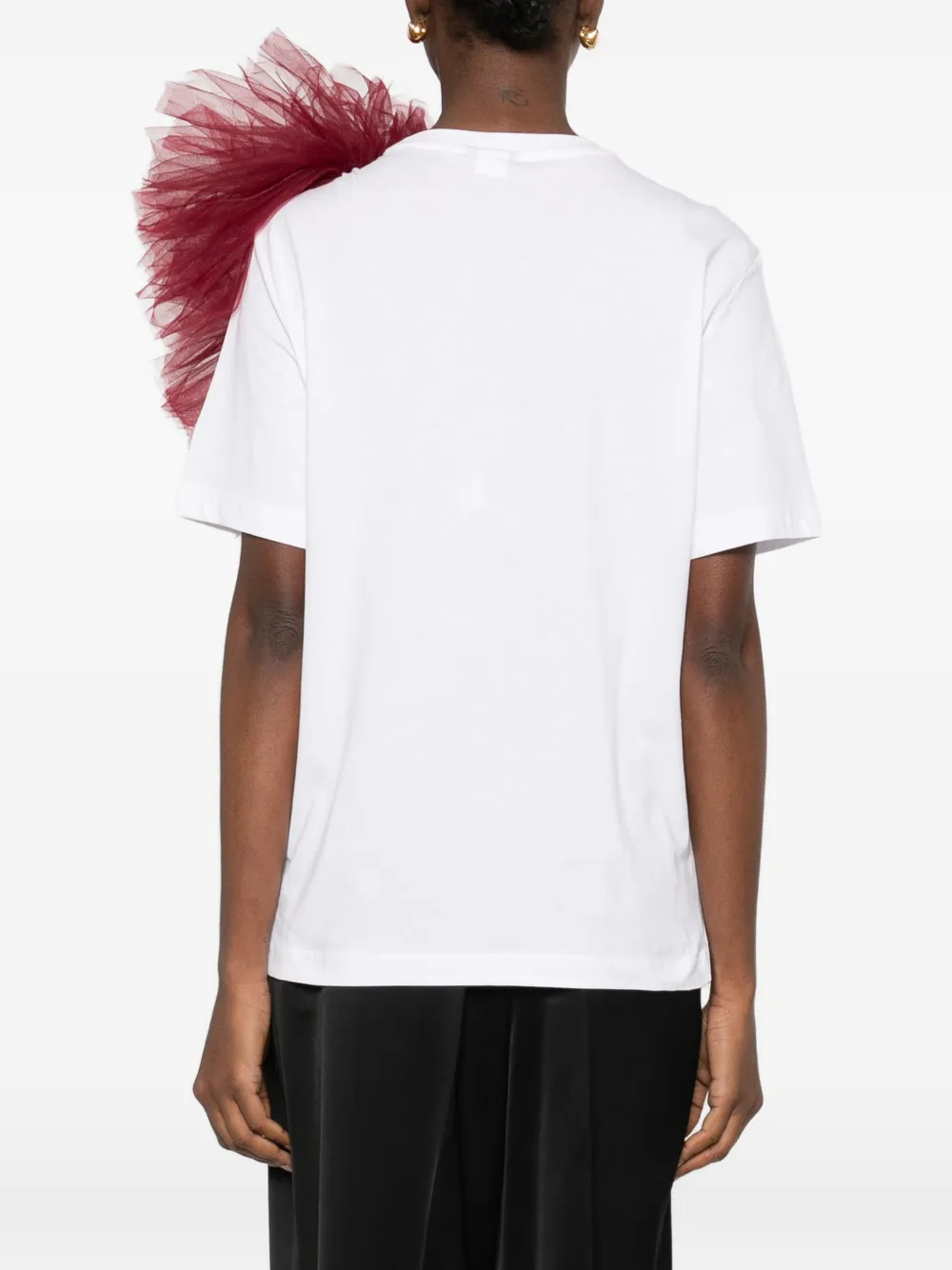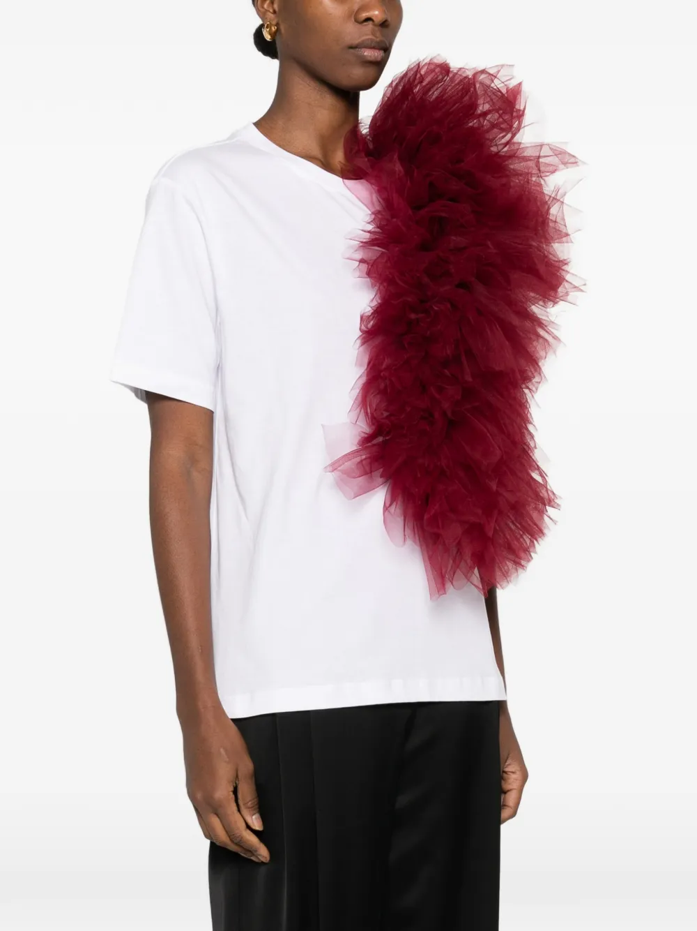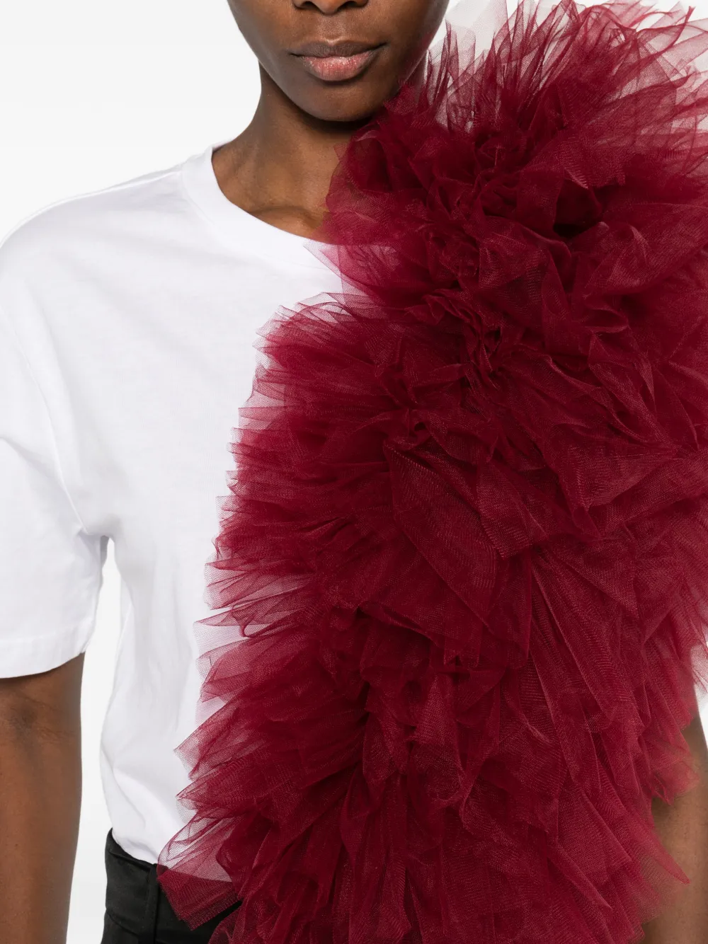 Белая и красная футболка с оборками, круглым вырезом и короткими рукавами