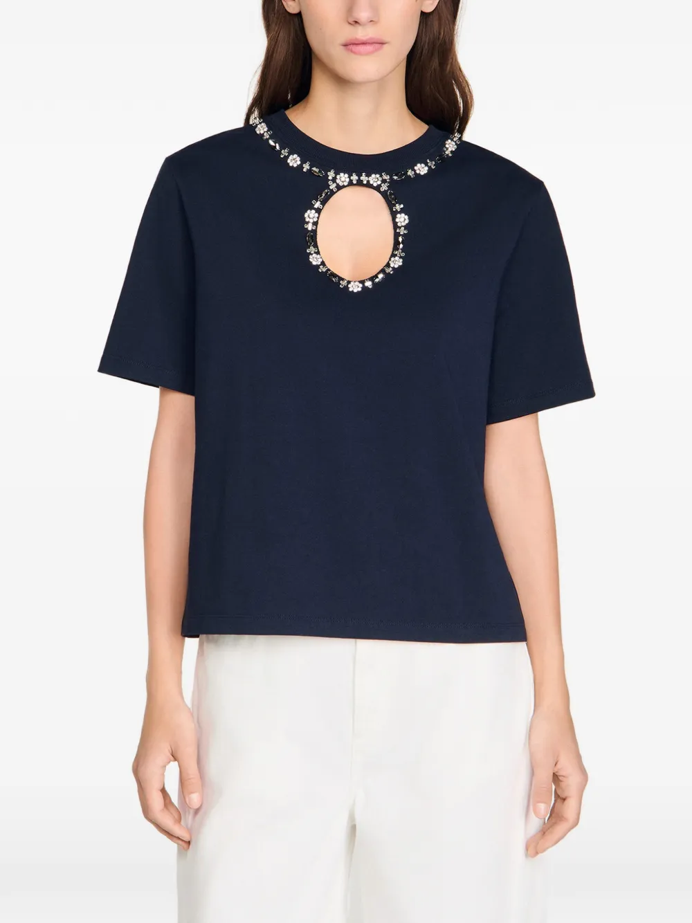 Футболка с ажурной отделкой и стразами Sandro, синий 21 659₽