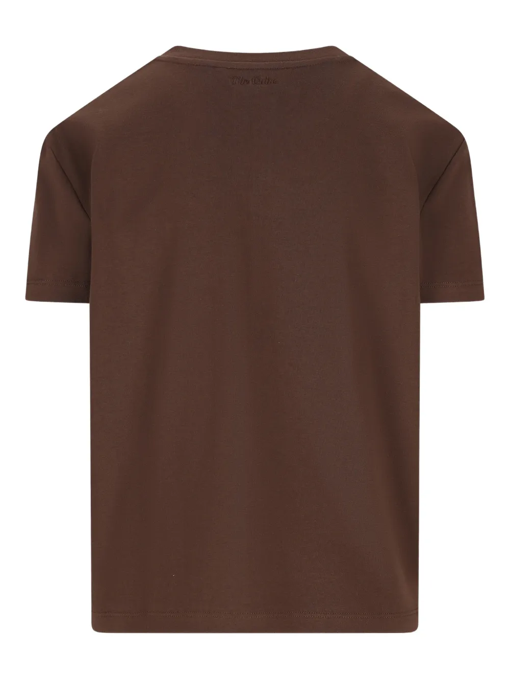Коричневая футболка с графическим принтом, круглым вырезом, короткими рукавами, тональной прострочкой и прямым подолом