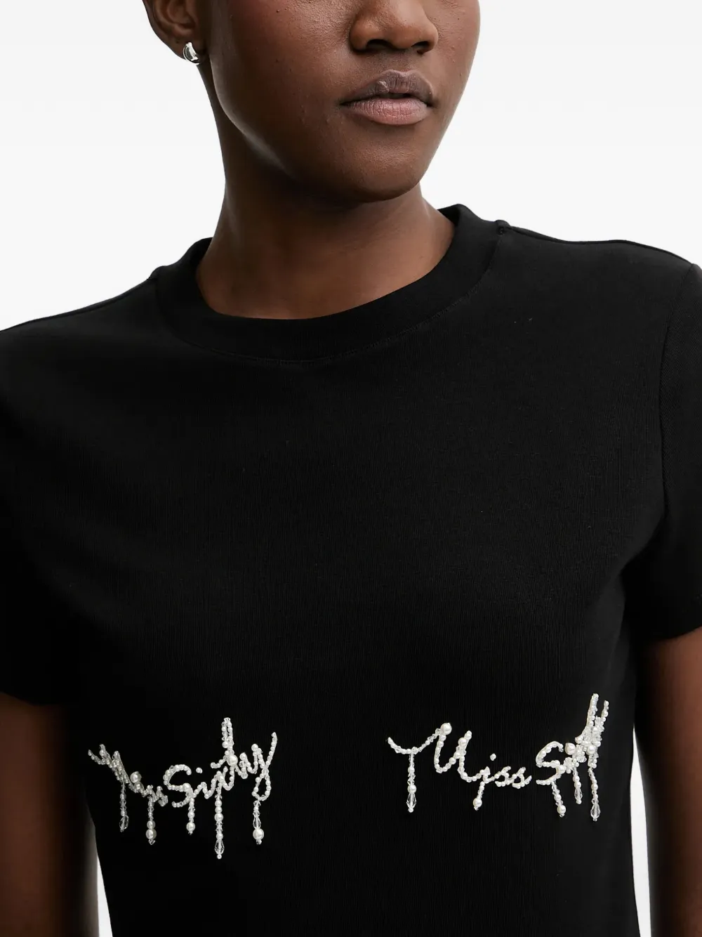 Черная футболка с круглым вырезом, короткими рукавами и украшением из бусин