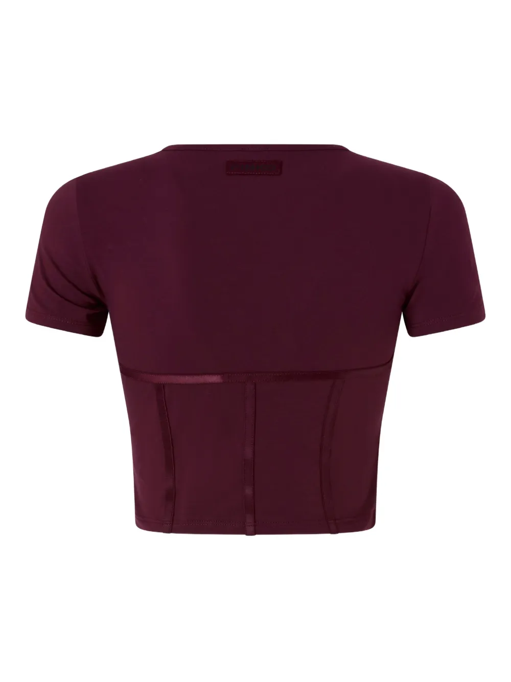 Темно-бордовый топ с короткими рукавами, корсетными деталями и круглым вырезом